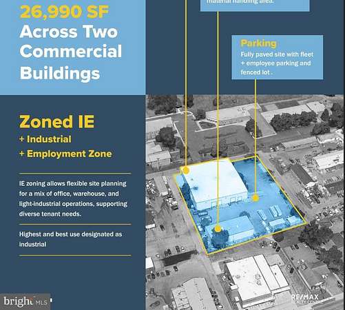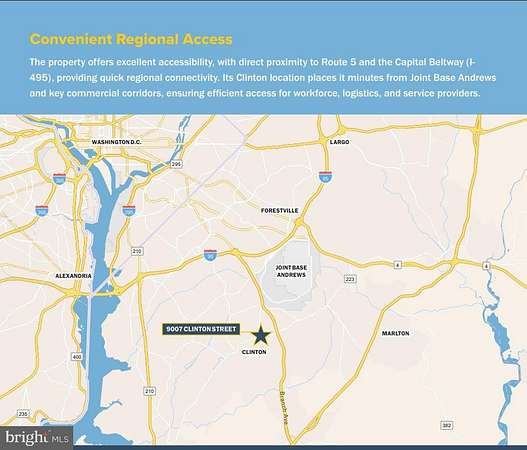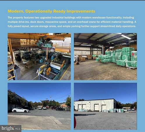The property features two upgraded industrial buildings with modern warehouse functionality, including multiple drive-ins, dock doors, mezzanine space, and an overhead crane for efficient material handling. A fully paved layout, secure storage areas, and ample parking further support streamlined daily operations IE zoning allows flexible site planning for a mix of office, warehouse, and light-industrial operations, supporting diverse tenant needs. Highest and best use designated as industrial. - Credit Tenant - 1.547 acres - Located in Clinton, MD, minutes from Joint Base Andrews, Route 5, I-95 and I-495 - Fully paved site with fleet and employee parking and a fenced lot - Clear height up to 26' in the 9007 Clinton St building - Crane - Mezzanine floor in both buildings Building 1 Two-story office + warehouse with 3 drive-ins, 4 dock doors, mezzanine, and an overhead crane (approx. 80% of warehouse). Fully paved site with fleet + employee parking and fenced lot . Building 2 Additional shop and storage with mezzanine, forklift-accessible material handling area. The property offers excellent accessibility, with direct proximity to Route 5 and the Capital Beltway (I495), providing quick regional connectivity. Its Clinton location places it minutes from Joint Base Andrews and key commercial corridors, ensuring efficient access for workforce, logistics, and service providers.