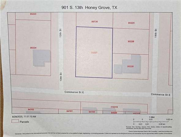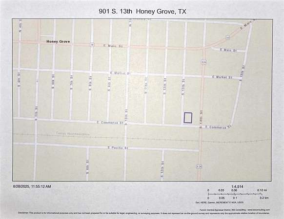 From Downtown Honey Grove, go East on Hwy 56, AKA E. Main Street, for 7 blocks to S. 13th Street. Turn right (South) onto S. 13th Street and go 2 blocks to the corner of S. 13th and Commerce Streets. Property will be on the left side of the street. Sign at property.