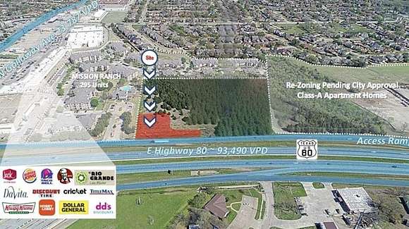Prime commercial opportunity in East DFW! This 2 acre parcel of unimproved land is ideally positioned with direct frontage on US Highway 80 in Mesquite, offering high visibility and excellent access for your next development project. Zoned for commercial use, this lot is surrounded by dense residential and retail developments, including the adjacent 295-unit Class A luxury apartment community, Advenir at Mission Ranch, with rental rates ranging from $1,300-$2,300. The location benefits from a strong traffic count and close access to major highways including I-635, I-30, and I-20, providing seamless connectivity to Downtown Dallas, Garland, Richardson, and Plano. With city water, city sewer, curbs, and electricity already available, the infrastructure is in place to support your build. Located in Mesquite ISD and minutes from established neighborhoods, shopping, and services, this lot is perfect for retail, office, or service-driven development. The land features grassed and wooded vegetation, few trees, and no subdivision restrictions--offering flexibility to suit your vision. Call the listing agent today for more details and to explore this prime investment opportunity!