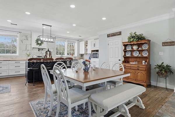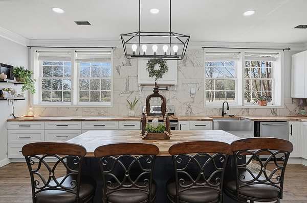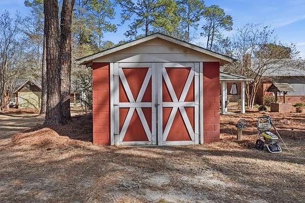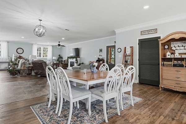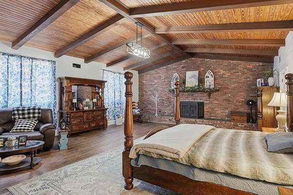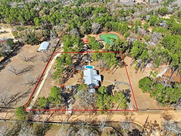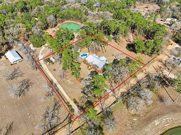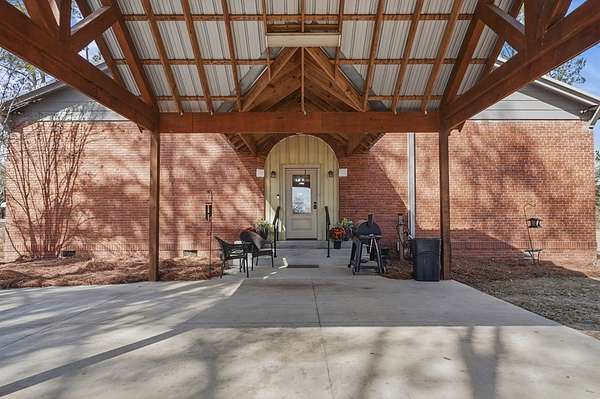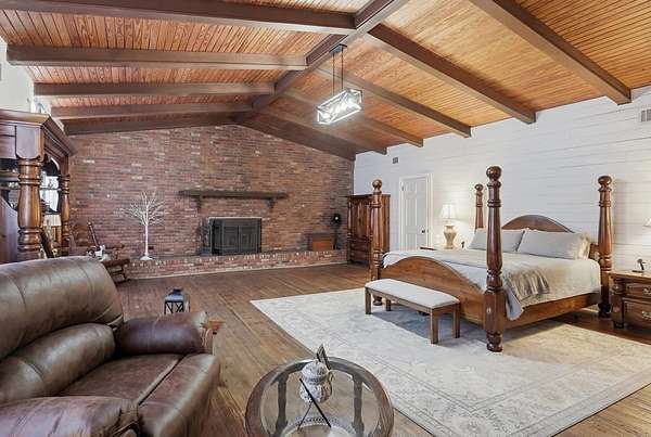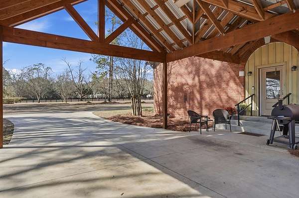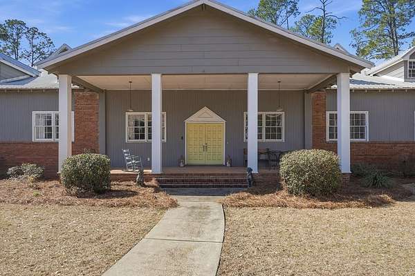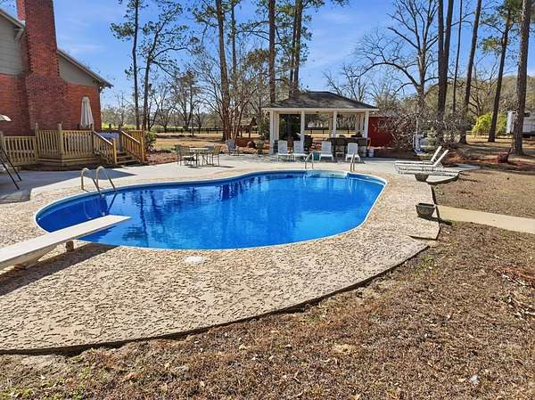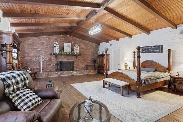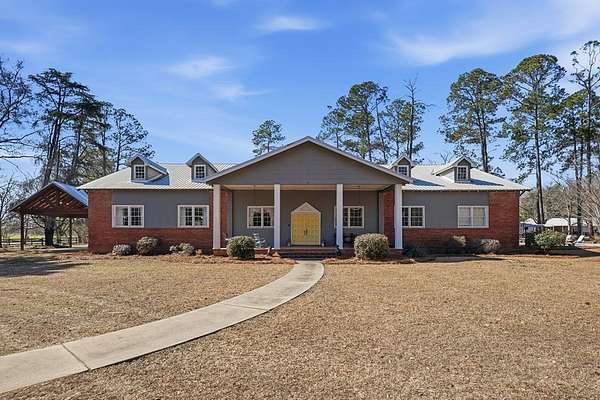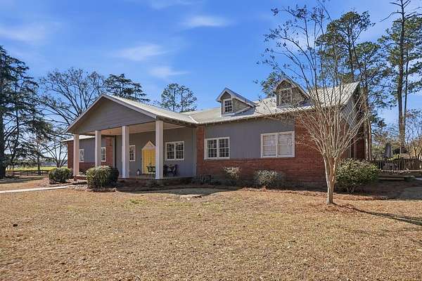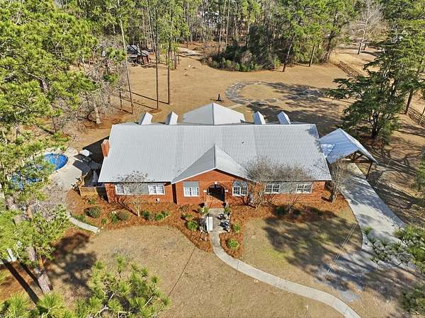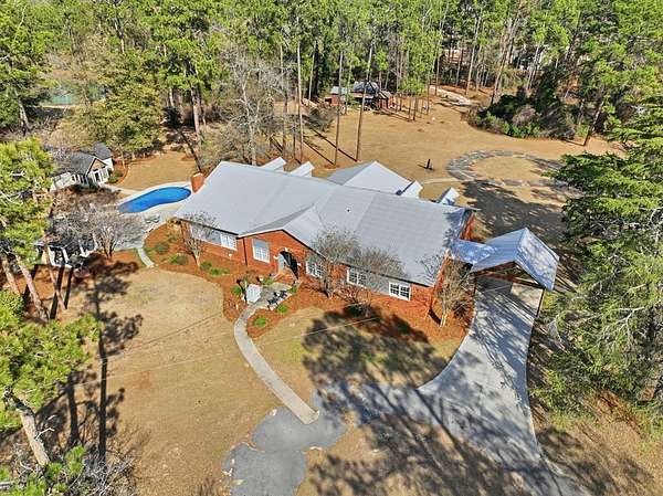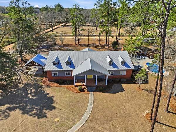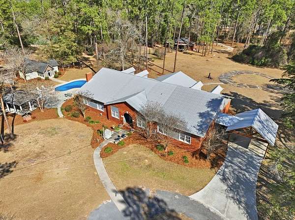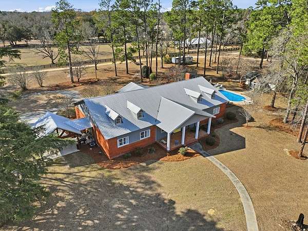 Situated on 3 beautiful acres, this 4 bedroom, 3 bath brick estate delivers space, charm, and unforgettable outdoor living. Inside, you'll find warm wood beams, a statement brick fireplace, and spacious living areas designed for both comfort and entertaining. The beautifully updated kitchen features quartz countertops, custom cabinetry, a large island with seating, and abundant natural light. The primary suite offers a relaxing retreat, while the additional bedrooms provide flexibility for family, guests, or office space. Step outside and experience true Southern living. The covered patio overlooks a sparkling in-ground pool, expansive yard, and a charming guest house perfect for visitors, or a private workspace. The detached 1 bed/1 bath guest cottage adds incredible versatility and value. With timeless brick construction, inviting curb appeal, and room to spread out inside and out, this property delivers the lifestyle you are looking for.