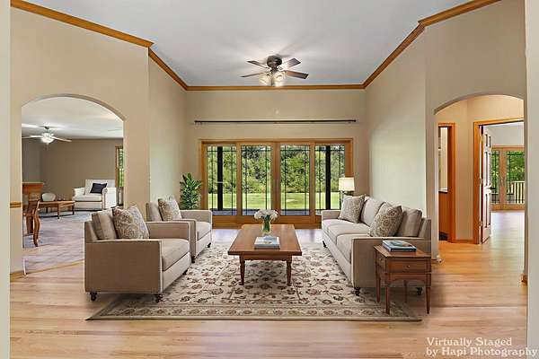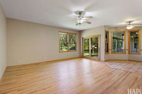 Welcome to this impressive 4-bedroom, 3- full bath ranch tucked away in a quiet cul-de-sac, two spacious lots, offering both privacy and room to grow. This property blends comfort with modern upgrades, making it a rare find. Step inside to discover a freshly painted interior, refinished hardwood floors and an expansive layout designed for everyday living and entertaining. One of the three full baths offers access to outside making it perfect for easy clean up or for your future pool. The oversized 3-car garage is heated,8 foot doors perfect for vehicles, storage, or a workshop. Additional features include a brand-new roof, heated floors in both the garage and basement, and a whole-house back-up generator for peace of mind. The full, large unfinished basement boasts soaring 9-foot ceilings, offering endless potential for a custom living space, recreation area, or home gym. Outside, the secluded setting provides tranquility, while the double lot offers space for outdoor activities, gardening, or a future pole barn
