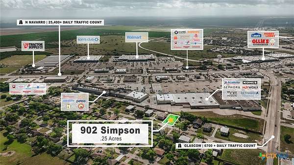 This .25-acre lot at 902 Simpson is ideally located just off N Navarro Street in one of Victoria's fastest-growing retail corridors. Positioned near a newly developed shopping center featuring Burlington, Five Below, and Ulta, with additional retailers including Chicken Salad Chick, Petco, and Dave's Hot Chicken coming soon, this property benefits from strong surrounding growth and increasing demand. The area is well-established with nearby multi-family developments, making it a great fit for future investment or development. With convenient access to major roads, shopping, dining, and everyday amenities, this lot is well positioned in a high-traffic, high-growth location.