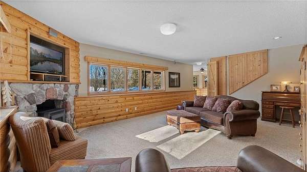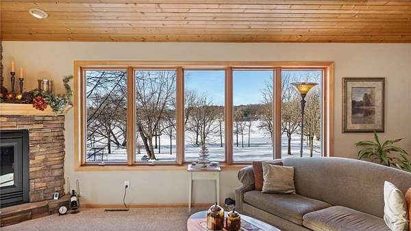 A cozy living room with a second fireplace and look-out windows showcasing the peaceful surroundings