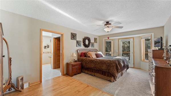 The primary suite is a peaceful retreat with a luxurious bathroom featuring a walk-in closet, tiled shower, and spa tub. And the best part, a private deck that enjoys morning sun for sipping coffee and appreciating what the day has to offer.