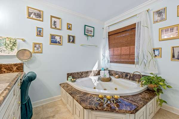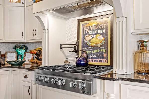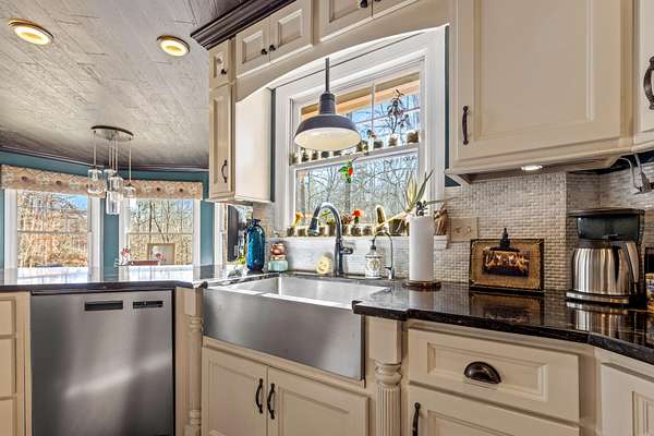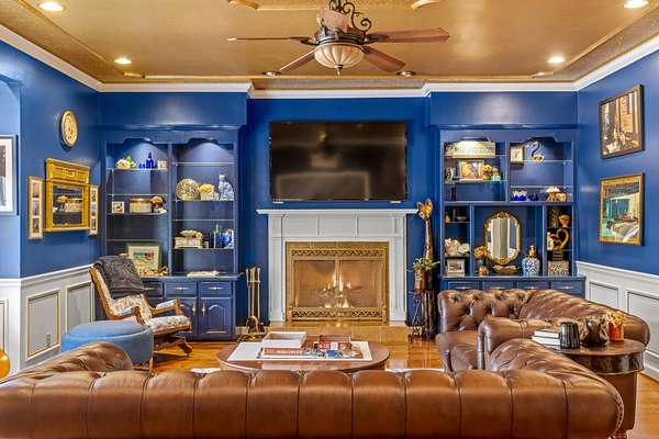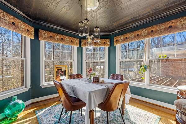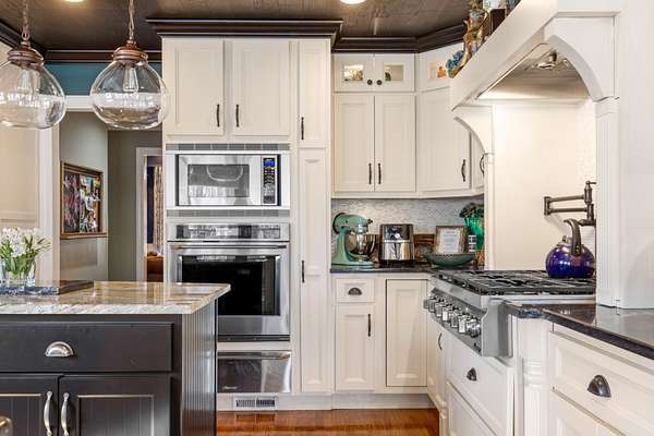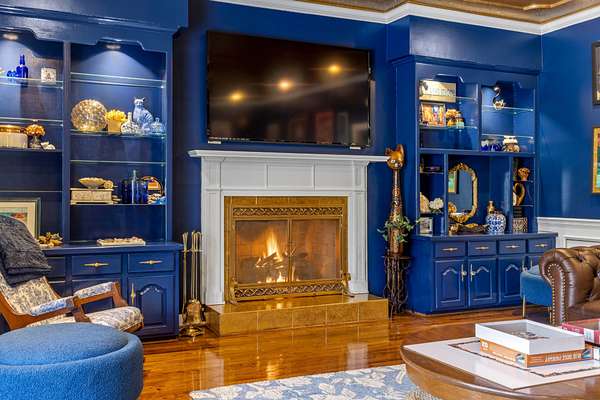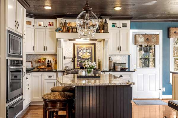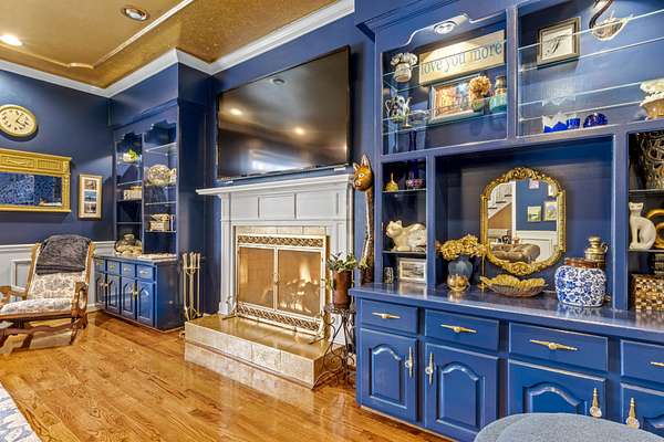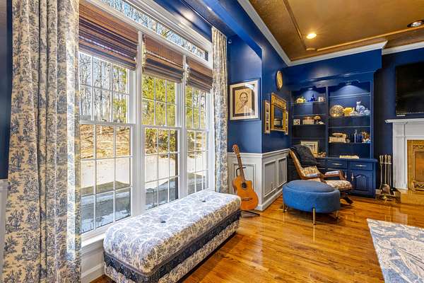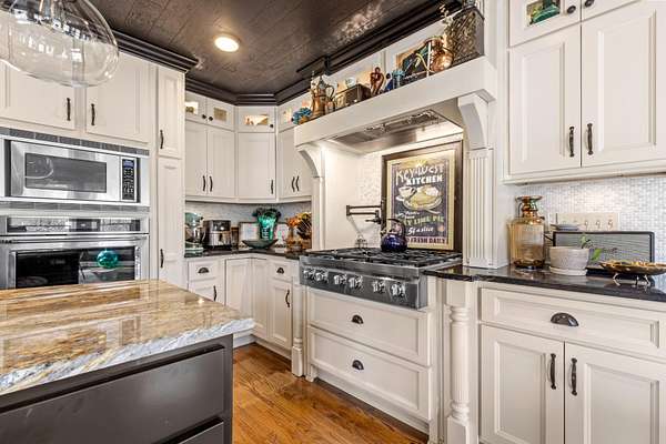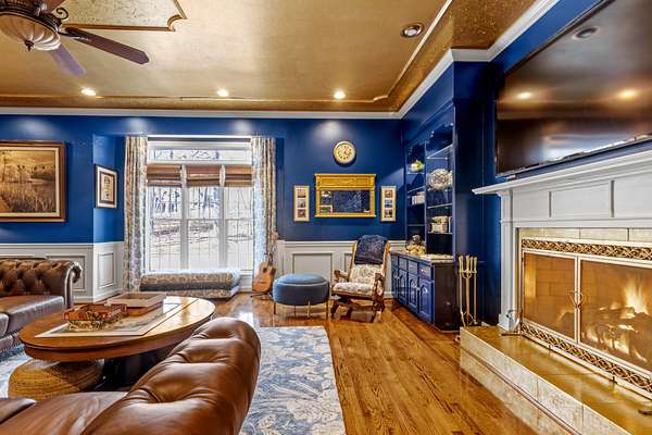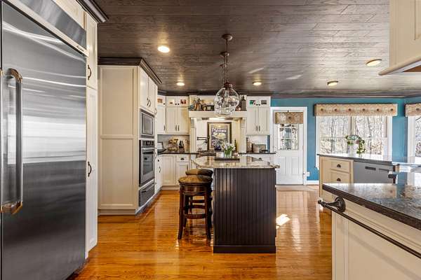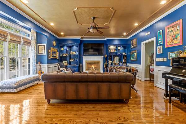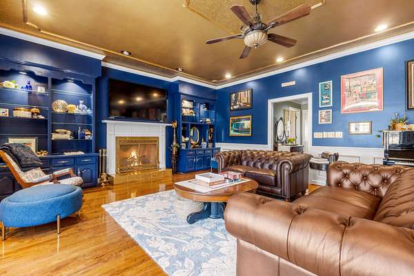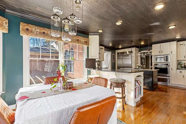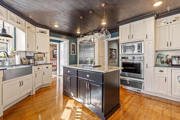 The heart of the home is the beautifully updated kitchen, complete with granite countertops, a large island, stainless appliances, and an inviting breakfast nook surrounded by windows. Multiple living and entertaining spaces include a formal dining room and a stunning living room with custom built-ins and a cozy fireplace.