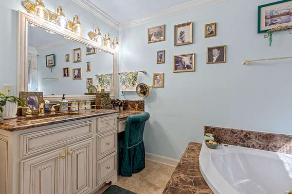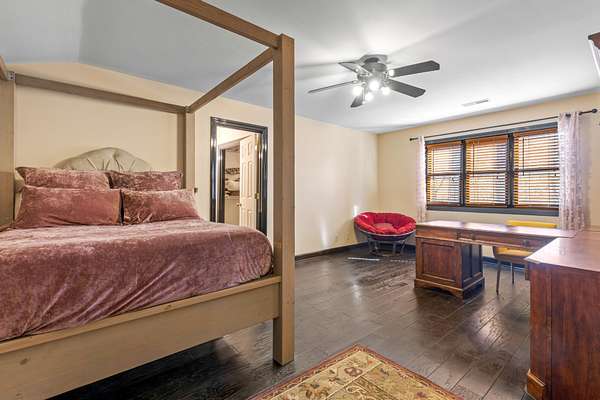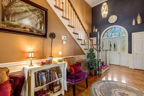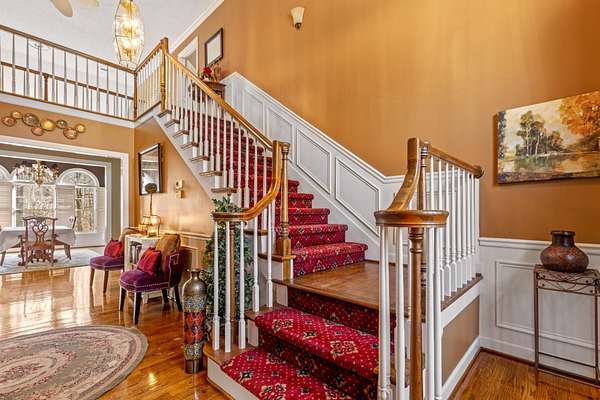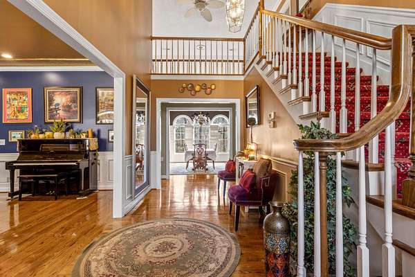 Step inside to a grand foyer with soaring ceilings, rich hardwood floors, and a sweeping staircase that sets the tone for the home's impressive interior. The main-level primary suite provides convenience and privacy, featuring generous space, a walk-in closet, and a well-appointed en suite bath.