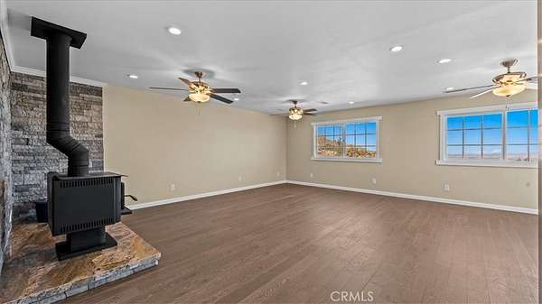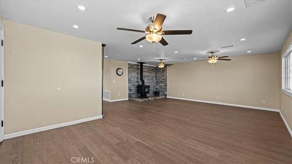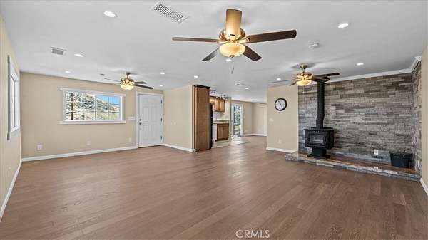 Inside, you'll find an inviting open floor plan with laminate flooring, recessed lighting, and ceiling fans throughout. The spacious living room features a cozy wood-burning stove with a stacked stone accent wall, creating a warm and welcoming feel.