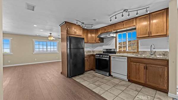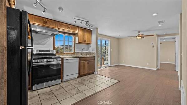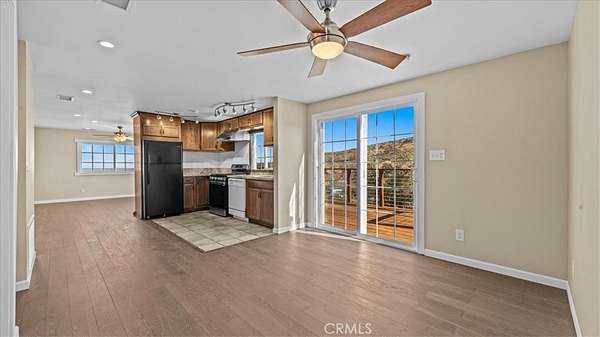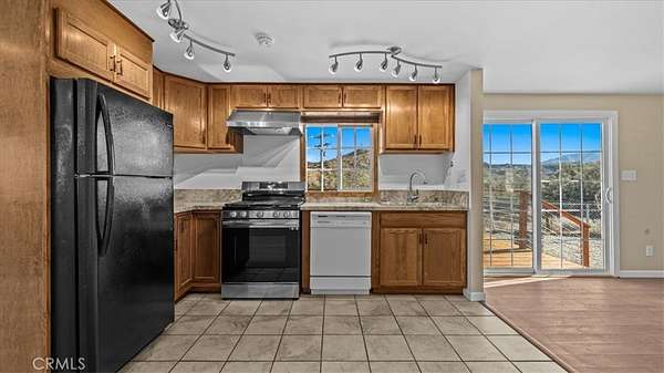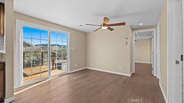 The kitchen features track lighting, and ample counter space, open to a dining area with sliding doors that lead out to a large wood deck, a great spot to enjoy the peaceful surroundings.