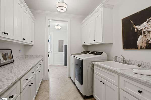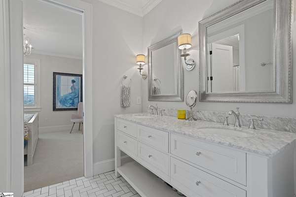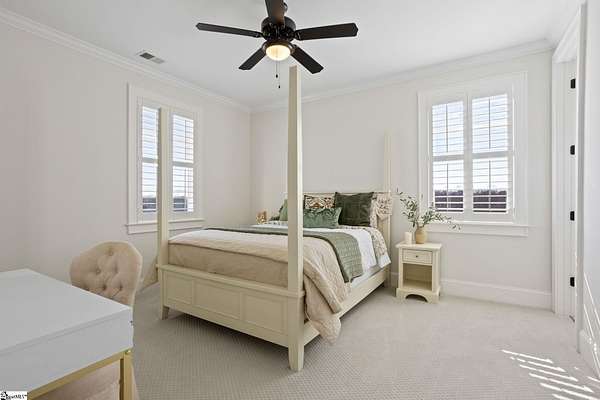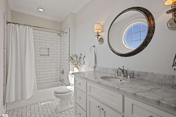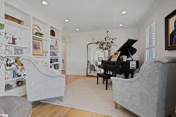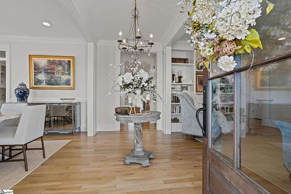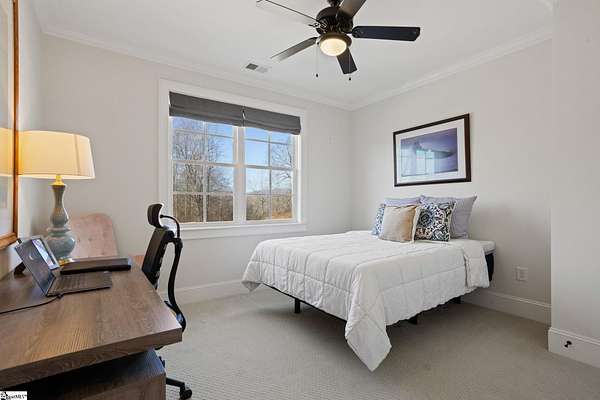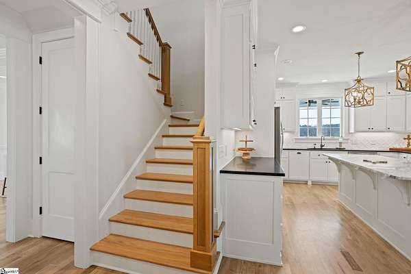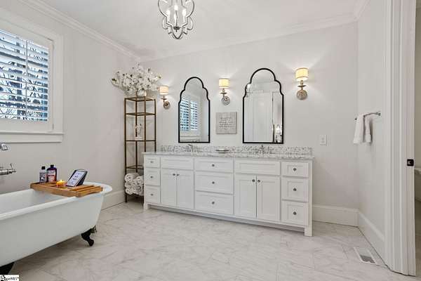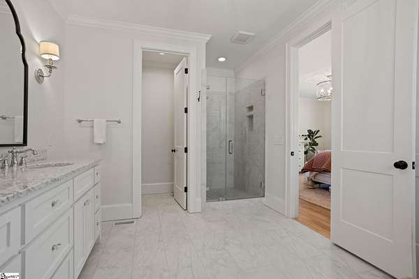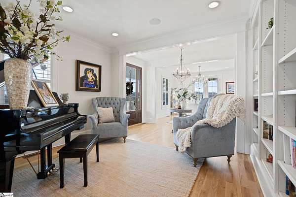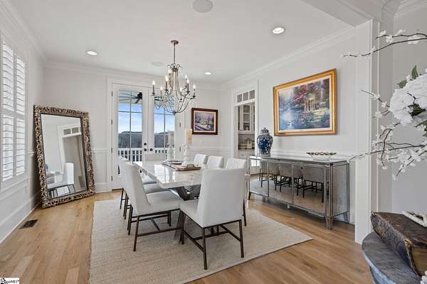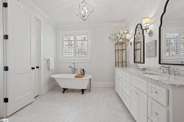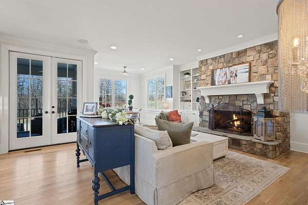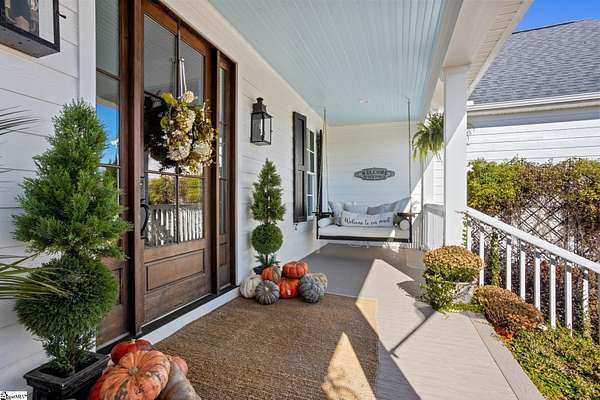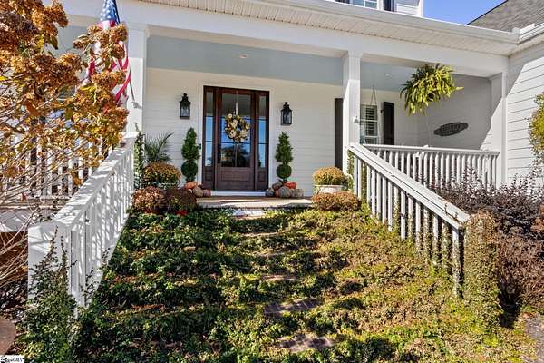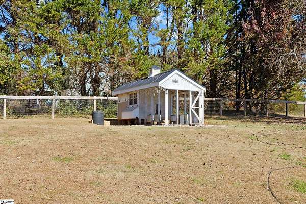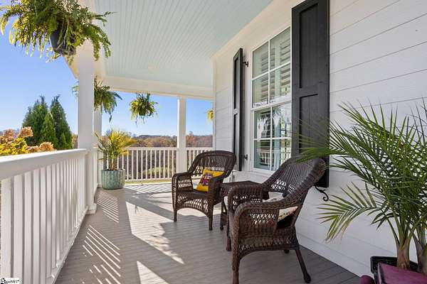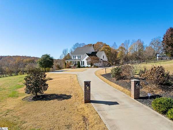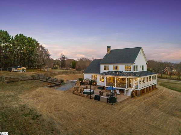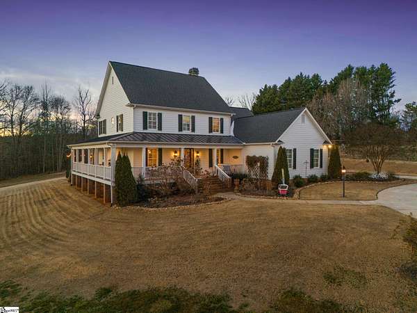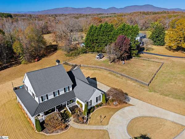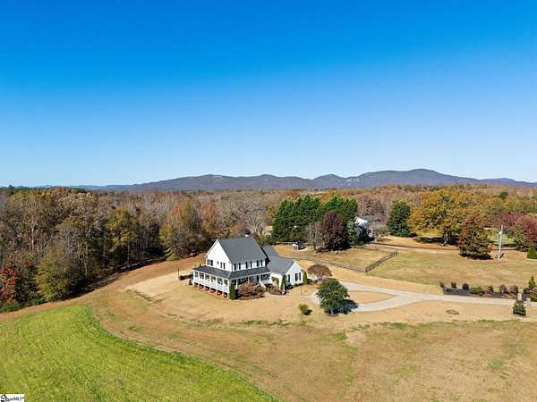 La Belle Vie Farm — the beautiful life, lived well. / Set on more than ten rolling acres in Landrum, this modern farmhouse estate unfolds across open meadows, distant mountain views, wooded trails, and a creek tracing gently along the edge of the property. From the covered wraparound porch — along with the screened porch for warmer evenings — the horizon stretches wide and pastoral. It is the kind of view that quiets you. / Originally custom built, the home reflects classic farmhouse architecture paired with elevated finishes. Solid white oak hardwood floors anchor the main living areas, complemented by 9' ceilings and 8' interior doors that lend scale and presence throughout. Built-in speakers extend across the main level and onto the porches, creating seamless indoor-outdoor entertaining. / The gourmet kitchen is both beautiful and functional, featuring honed granite countertops, a seven-foot marble island, a professional gas range with vent hood, and a walk-through butler’s pantry with lighted glass-front cabinetry. Designed for gathering, the space opens naturally into the heart of the home, where a striking stone fireplace and custom millwork create warmth and architectural presence and a sunny breakfast nook can be enjoyed or reimagined for other uses. / The primary suite is privately positioned and enjoys its own mountain views. The ensuite bath includes a large tiled shower with glass enclosure, dual vanities, and a classic clawfoot tub. The custom primary closet is outfitted with built-ins by Carolina Closets for refined organization. / Upstairs, a loft-style den or rec room provides additional living space, along with three bedrooms, two elegantly appointed full baths, and unfinished attic space above the garage offering future flexibility. / Recently, the main level has been extensively refreshed including new white oak hardwood flooring and fresh interior paint, creating an interior that feels light-filled and renewed. / Outdoor living has been impressively expanded with a custom three-tier patio and outdoor fireplace overlooking pasture, creek and mountain views. The grounds have been enhanced with curated landscaping and new sod, complementing the natural elegance of the acreage. Trails lead toward the rear pasture, offering open space and a connection to the land that defines this property. Along the side yard, a charming custom chicken coop and fenced grazing enclosure provide a graceful nod to refined country living — ideal for small animals, hobby farming, or simply embracing the rhythm of life on open land. / La Belle Vie Farm is not just a home. It is an experience — where land, light, and abundance of life come together in quiet reverence. / Schedule your private tour today, while this opportunity remains. Presented by Ronnetta Griffin, Griffin Fine Real Estate 864.884.8369