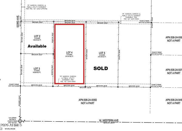 I-10 West to Harquahala Valley Road. South to Buckeye Rd/Western Ave.. West to 523rd Ave. North 1200 ft. to the SW corner of the parent parcel. East to the black sign at the SE corner of Lot 4.