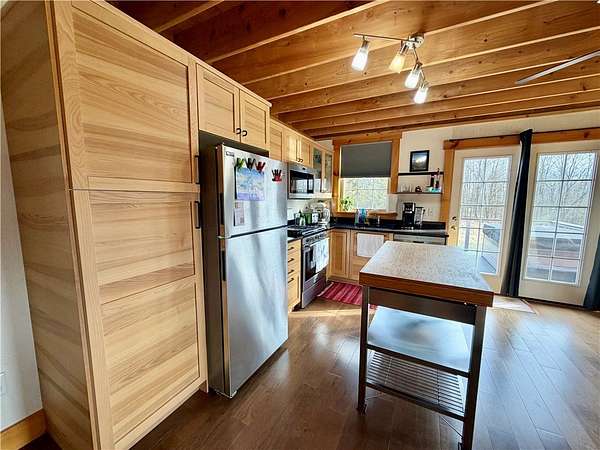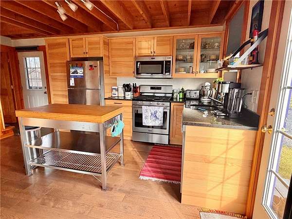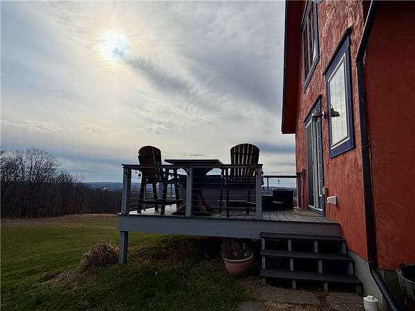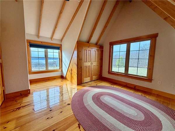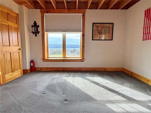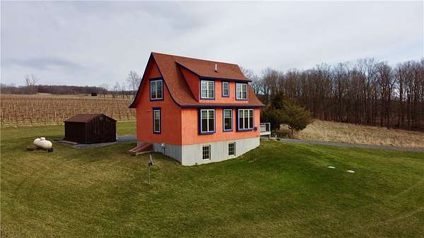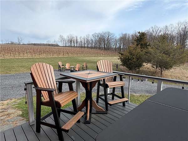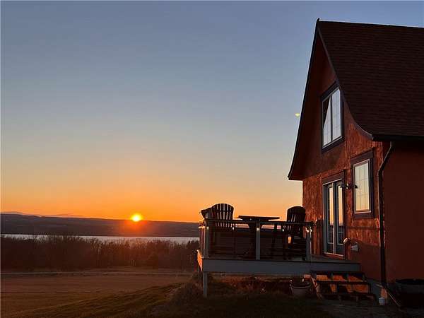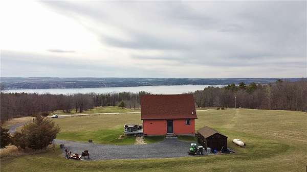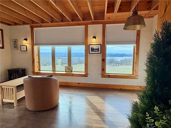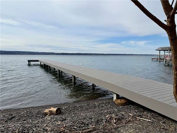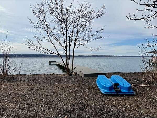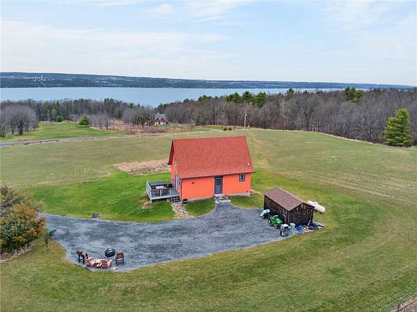 Seneca Lake views and private lake access are yours with this custom two story chalet inspired home. Backed by acres of vineyards overlooking the lake, the home is just down from Rt. 414, in a private subdivision off of Rhodes Rd. The neighborhood is comprised of mostly 2-10 acre wooded parcels, with homes enjoying stunning views and privacy. This chic home, built in 2019 is a custom cottage with all the bells and whistles. Filled with light from the well placed windows, we start with a main level master and bath/laundry suite, fully equipped kitchen, and living room with propane heating stove on the main floor, all wrapped in warm wood finishes including long-lasting hickory floors. The second level with lake facing dormer windows includes a bedroom, bath, and living room to accommodate guests or family. Plenty of private spaces even with the open floor plan below. The lower level, constructed with Superior insulated concrete walls and exterior Bilco access, offers excellent potential for future finished space while currently serving as a functional studio and storage area. Heat is supplemented by electric baseboards in the basement and master bedroom/bath, but the owner mostly enjoys heating the entire home with the propane stove in the living room. On the deck, the perfect wind-down opportunity - a new 2025 hot tub for two, with room for your wine service! What truly sets this property apart is the included ~25 feet of lake frontage, which is just a short distance away via Andrea Drive, including a brand-new Trex dock. Whether arriving by boat or taking the scenic newly constructed stairs (2025) down, this dedicated access point provides everything you need to fully embrace lake life-without the burden of high waterfront taxes. Shared road maintenance is an easy $250 per year. There is only one property like this - don't hesitate to seize the moment!