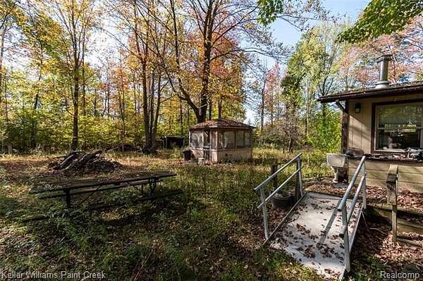 The property also features several practical structures such as an 8x12 deck, a 12x12 screened pavilion, a 12x18 shed, an additional 8x8 shed, and an 8x16 firewood shelter. Surrounded by mature woods and set along a paved road, this location provides a private rural setting with convenient access.