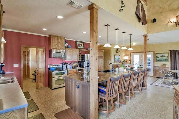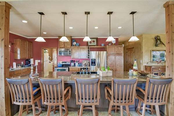 - Built-In Features, Cathedral Ceiling(s), Decorative Lighting, Double Vanity, Eat-In Kitchen, Flat Screen Wiring, Granite Counters, High Speed Internet Available, Kitchen Island, Open Floorplan, Second Primary Bedroom, Sound System Wiring, Vaulted Ceiling(s), Walk-In Closet(s), Wet Bar