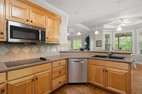 - Dishwasher, Disposal, Double Oven, Electric Cooktop, Microwave, Refrigerator, Self Cleaning Oven