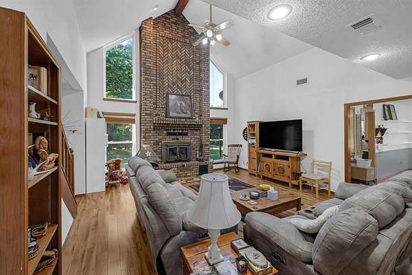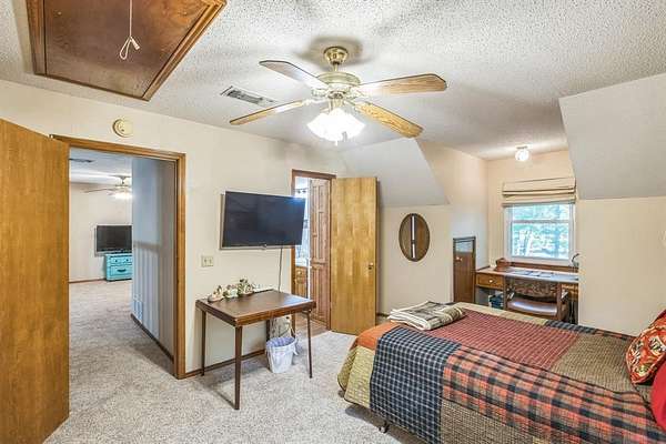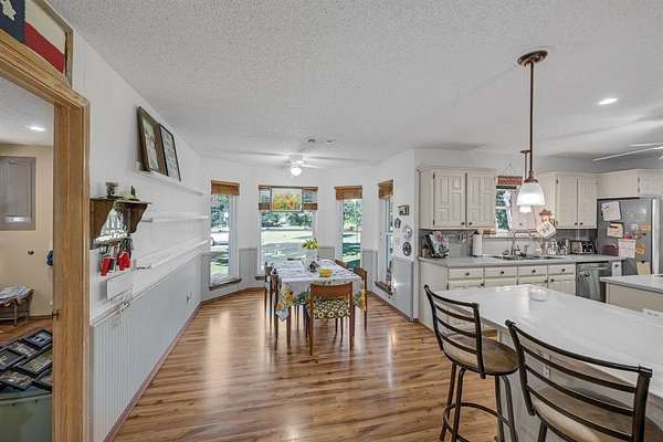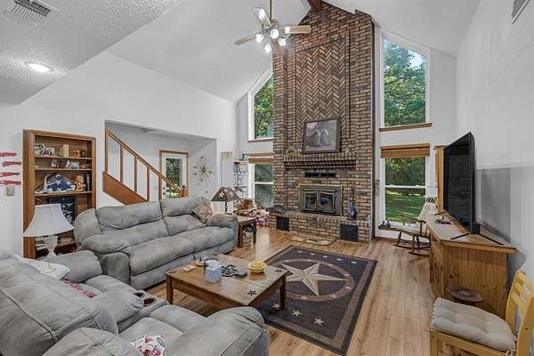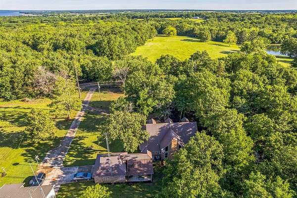 Offering the perfect blend of luxury and rustic charm at this pristine property nestled in the serene landscape of Honey Grove, TX. Situated within the esteemed Honey Grove ISD, this Global Luxury estate offers 3 spacious bedrooms, 2.5 baths, and a two-car garage, encapsulating sophisticated ranch-style living. Upon entering, be greeted by a warm, inviting atmosphere accentuated by luxury vinyl flooring that flows seamlessly throughout. The living area serves as a cozy retreat with its standout floor-to-ceiling fireplace and vaulted ceilings, offering stunning views of the heavily wooded backyard. The kitchen is a culinary enthusiast's dream, showcasing crisp white cabinetry, Corian countertops, and top-of-the-line stainless steel appliances, including a double oven. This culinary space transitions smoothly into a versatile office or formal dining area, ideal for both casual and formal gatherings. The primary bedroom suite is a private sanctuary, generously sized with an ensuite bath featuring an oversized shower and an expansive storage closet. Upstairs, two additional bedrooms share a secondary living area and a well-appointed full bath, offering ample space for relaxation or recreation. Exterior features of this property are equally impressive. The brick facade and wrap-around porch are designed for tranquil star-gazing or watching nature's wildlife spectacle. A storm shelter ensures peace of mind, while the 30x36 metal workshop comes fully equipped with electricity and water, offering endless possibilities for projects or storage. Additional space is provided by a 30x20 carport and a 12x36 loafing shed. The property also boasts a 1 acre stock pond with a floating deck, creating a picturesque setting where deer are frequent visitors year-round. This extraordinary property combines luxury living with the tranquil allure of nature. This is a RARE find and located approximately 6 miles from the new Bois D' Arc lake.