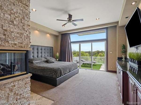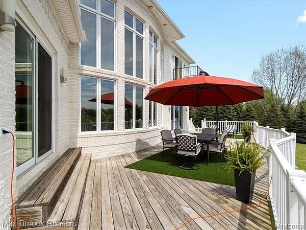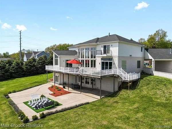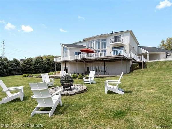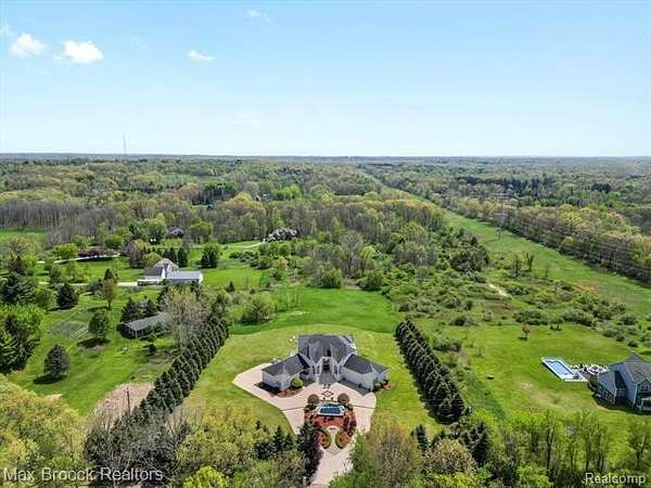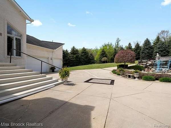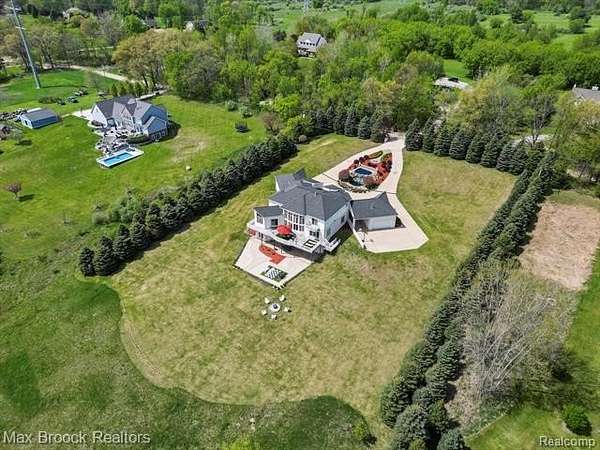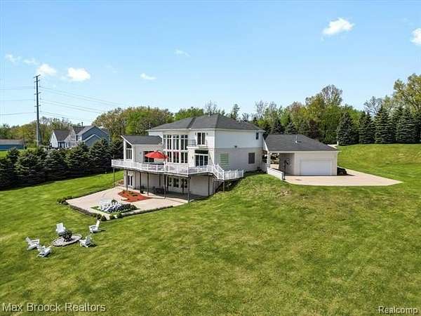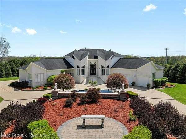 Contemporary Modern estate on 3+ private acres in Addison Township. This spacious home offers 5 bedrooms, 4 full baths, and 1 half bath, including two primary suites—one on the main floor and one on the second level. Open floor plan with clean lines and abundant natural light. The home features a 5-car garage setup with a separate 2-car and 3-car garage. A circular driveway with a water fountain feature provides an elegant entrance. Enjoy outdoor living on the expansive deck that spans the entire back of the home, overlooking a serene property with 100 planted pine trees for added privacy and beauty. The finished walk-out basement includes a home gym, game room, second kitchen, and full bathroom, offering flexible living and entertaining options. Located in a quiet, natural setting yet convenient to Lake Orion, Rochester, and area amenities. This property combines modern style, function, and seclusion. New refrigerator & wall oven in main kitchen!