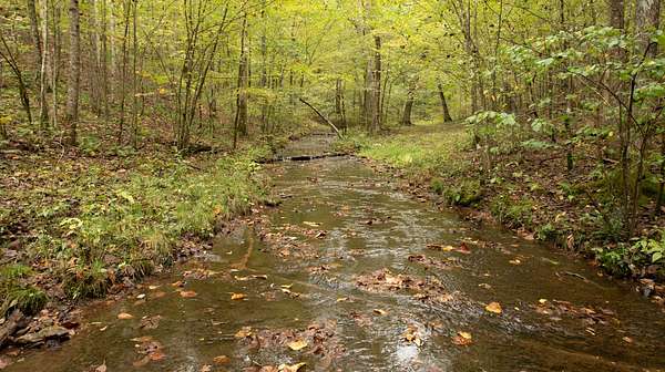A network of year-round creeks and streams traverses the property, supplemented by a pond that supports both wildlife and water management. Municipal water is available on site, providing a ready water source for future construction or camp facilities. The land's topography includes ridges, hollows, gentle slopes, and bottoms -- promoting variation in habitat, drainage, and building potential.