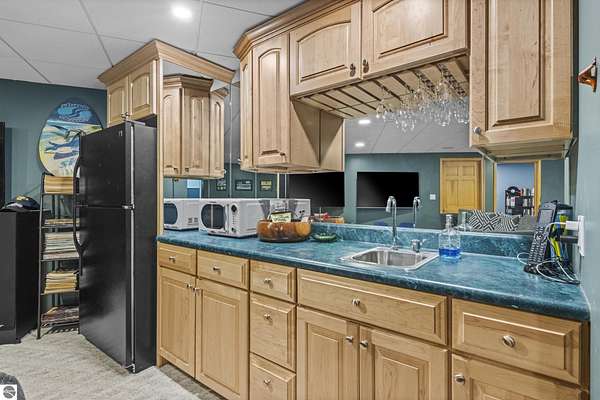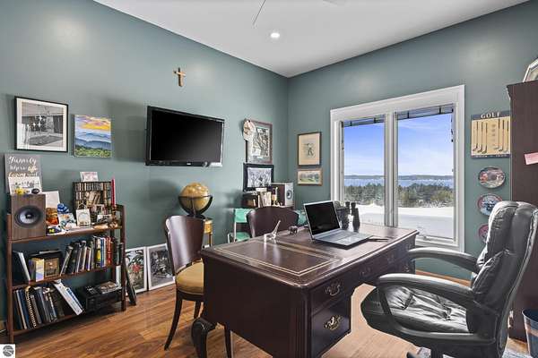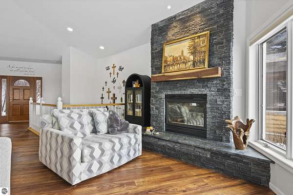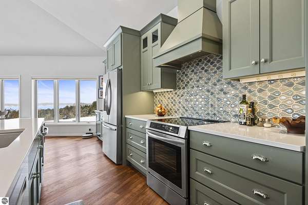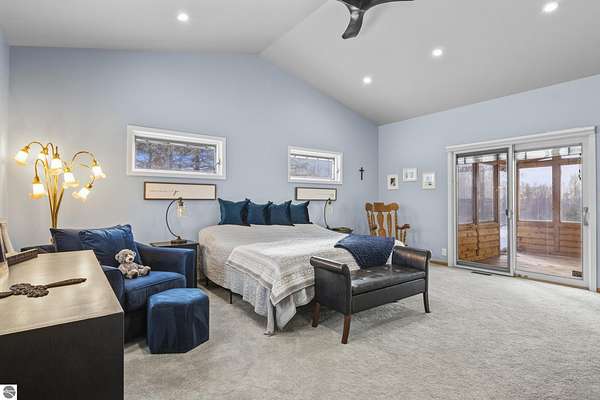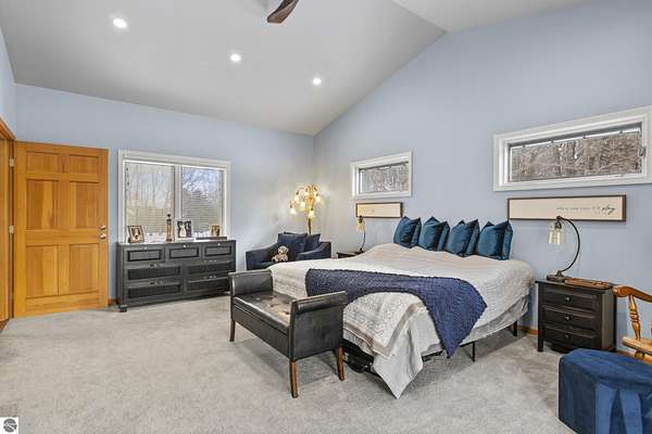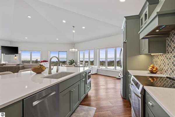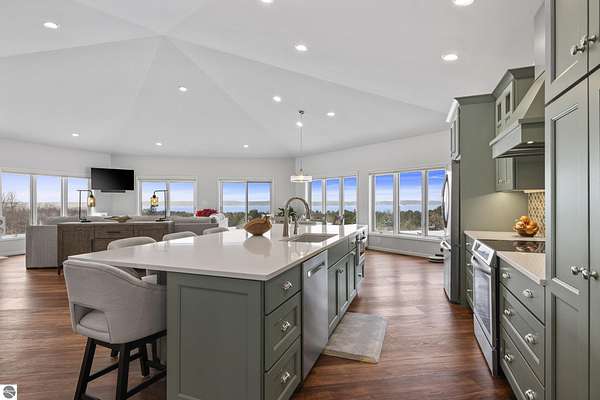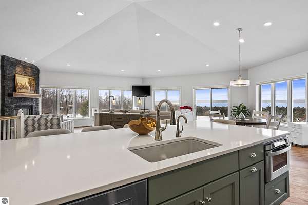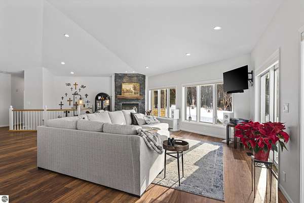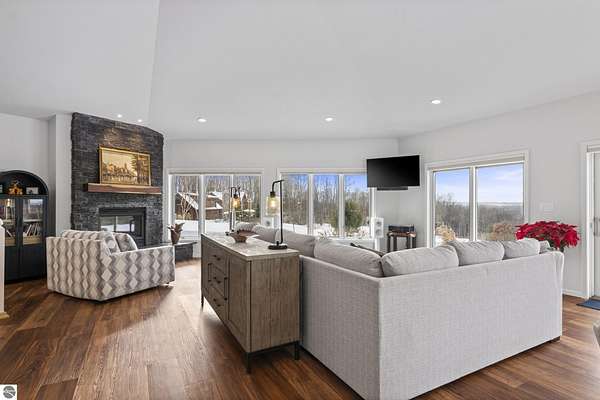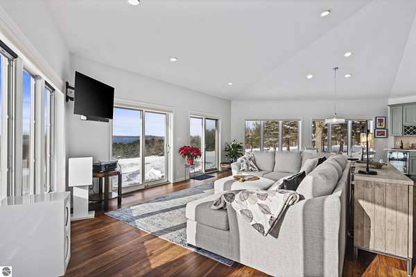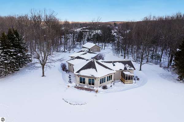 Four Season Million Dollar Torch Lake Views! Private Setting on 3.44 Acres. Located near the Historic Village of Alden, Torch Lake Boat Launch and Beach Access. Step Inside and be enveloped by the Outside with Wall to Wall windows framing Beauty that will WOW you...This meticulously Updated Home offers Comfort, Style, Functionality and is Uniquely Designed to capture the Beautiful "Water, Winter Wonderland" Lifestyle. Custom Designed Kitchen is a Cook's Dream with a 10 ft. Quartz Top Island. Custom Cabinets provide Ample Storage & Task Lighting. Top of the Line Appliances make Meal Preparation easy for everyday Living and Entertaining. The Spacious Open Living has a Vaulted Ceiling and Gas Fireplace. Luxury Vinyl Plank Flooring flows seamlessly throughout the Main Level. Desirable Split Floorplan with Private Primary Ensuite on one side of the Home and Two Additional Bedrooms, Bathroom and Laundry Room adjacent to the Double Car Garage on the other side. The Primary Suite opens to a Cedar Garden Room with Windows to Relax and Enjoy Nature. An Open Staircase Leads to the Lower Level with Entertainment/Family Room with Surround Sound, Kitchenette, Three-Quarter Bath, A Room suitable for a Home Office, Large Walk-in Pantry/Storage and Mechanical Room. The Home is equipped with Two Energy Efficient Furnaces and Hot Water Heaters. Exterior Speakers are located in the Front and Backyard. Mature Hardwoods, Ornamental Trees, and Perennial Plantings provide Seasonal Color. Outdoor Living is enhanced with a Brick Paver Patio, Electric Awning and Fire Pit. A 24x32 Detached Utility Garage has a Heater (ready for propane hookup). Attic Storage is accessible by Pull Down Stairs. This Home is Centrally Located with Easy Access to Torch Lake, The Chain of Lakes, Championship Golf Courses, Skiing, Marinas that offer In/Out Boat Launches, Cherry Capital Airport, Churches, Boutique Shopping and more. WELCOME HOME!
