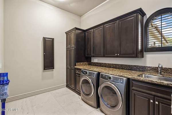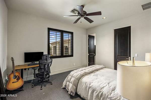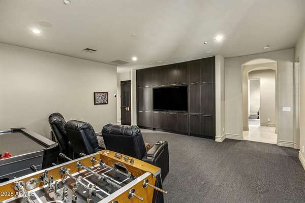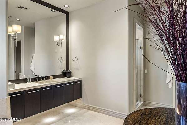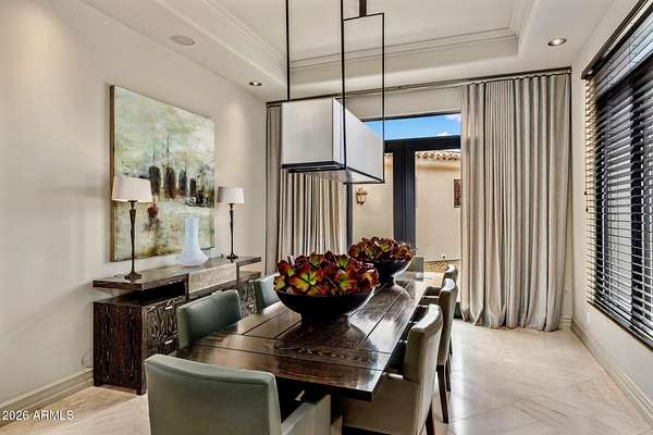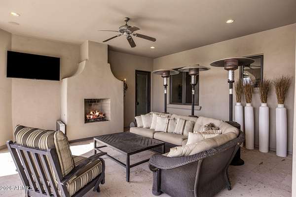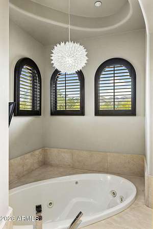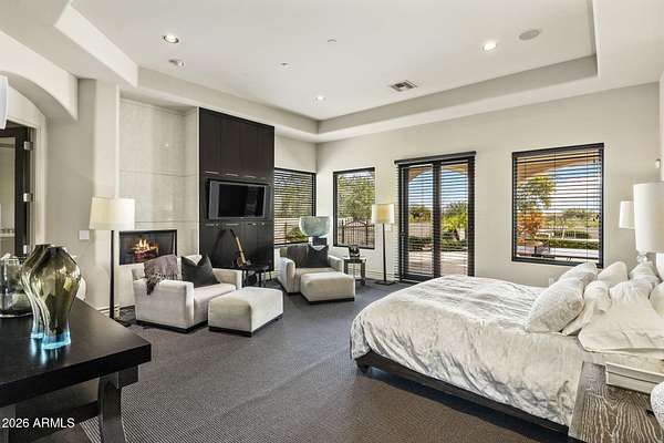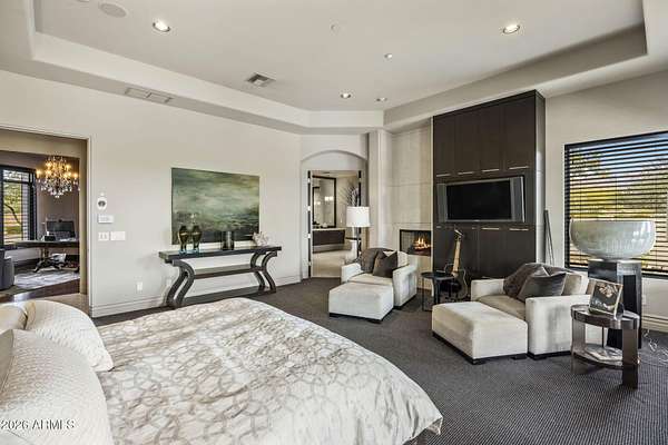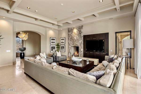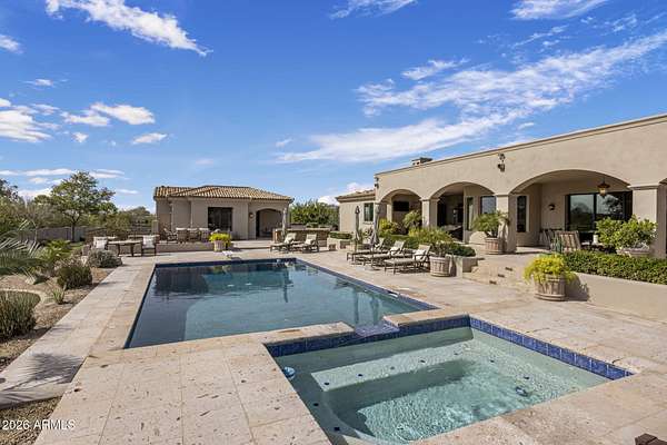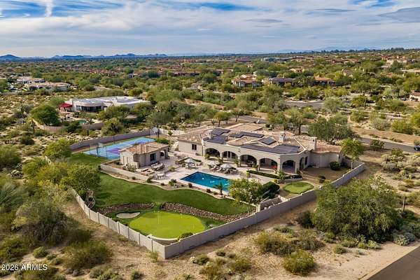 Situated on a sprawling 1.5-acre lot with sweeping and unobstructed mountain views and a sunny south-facing backyard, this fully reimagined North Scottsdale estate blends refined thoughtful design with true resort-style living. Mediterranean-inspired architecture and a circular paver stone driveway create a warm and inviting first impression. Inside, the great room welcomes with a dramatic floor-to-ceiling granite fireplace and an expansive sliding glass door that pockets completely into the wall creating an effortless indoor-outdoor connection. Stunning limestone floors flow throughout the main living areas and are complemented by designer light fixtures and modern touches throughout. The chef's kitchen showcases Quartz countertops, sleek cabinetry, a generous island, and premium stainless-steel appliances including a built-in wine fridge and beverage drawers. The primary suite is a true retreat, featuring a spacious bath with floating vanities, limestone flooring, and generous closet space. The guest wing offers 3 ensuite guest bedrooms, all connected to a large a bonus /media room that offers endless possibilities. A dedicated office, additional bedroom, and a formal dining room complete the main home. A detached casita serves as the 5th ensuite bedroom, ideal for guests, multigenerational living, or a private studio. Outdoors, the estate transforms into a private resort: two putting greens, a large sport court designed for both pickleball and basketball, a sparkling pool with deck jets, a raised spa with spillover, a built in BBQ, and a firepit create the perfect setting for outdoor gatherings against the stunning McDowell Mountain backdrop. Multiple covered living and dining areas, including a deep covered patio with a cozy fireplace, encourage year-round enjoyment. The property also includes owned solar and a 4-car garage with an electric vehicle charging station. Tucked away yet conveniently situated within 5 minutes of the 101 Freeway and within a mile to DC Ranch's Market Street, the home offers a rare blend of serene surroundings and exceptional accessibility. This is Scottsdale living at its finestrefined modern finishes, remarkable views, exceptional outdoor amenities, and easy connectivity to everyday conveniences.