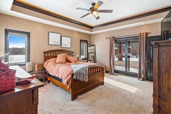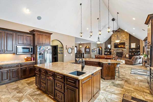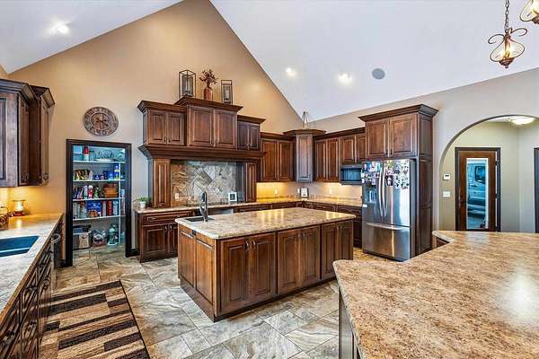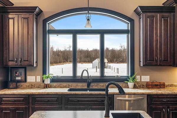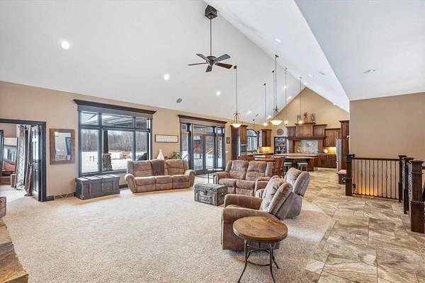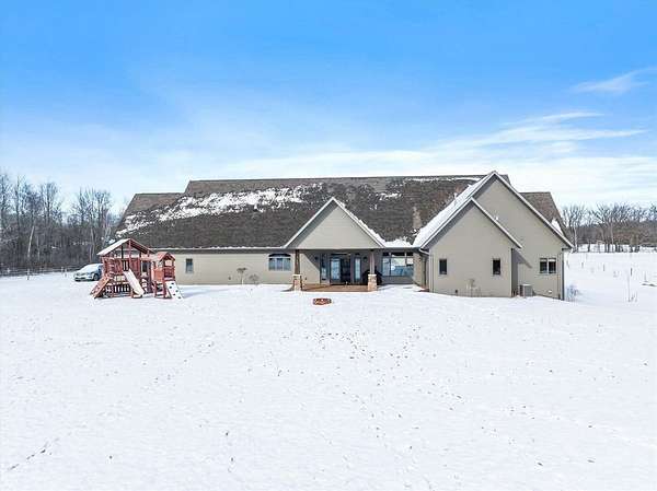 Discover a truly exceptional property where luxury, comfort, and thoughtful design come together in perfect harmony. This one-of-a-kind home offers an expansive layout crafted for both elegant entertaining and effortless everyday living. At the heart of the home is a stunning chef’s kitchen featuring double islands, abundant workspace, and an open design that naturally becomes the gathering place for family and guest alike. The adjoining dining and living areas are framed by breathtaking views, creating a warm and inviting atmosphere filled with natural light. The luxurious main suite servers as a private retreat, complete with a spa inspired bathroom featuring a walk-in shower and whirlpool tub - perfect for relaxing at the end of the day. Main level living is enhanced with the convenience of a laundry room and three additional Spacious bedroom designed with comfort and versatility in mind. Designed to accommodate a variety of lifestyles, the home also features a zero entry layout and a heated four-car garage with a dedicated dog wash station, combining practicality with premium amenities. The lower level offers and expansive family room and additional bedrooms, providing amps space for guest, recreation, or extended living. The potential for indoor heating ads an extra layer of comfort during Wisconsin’s cooler seasons. Try to enjoy the beautiful crafted stamped concrete patio, ideal for outdoor entertaining and relaxing. A stand-up future for the property is the impressive 48 x 84 building, complete with bar area, loft, bathroom, and office space offering endless possibilities for hobbies, entertaining or business use. The convenient drive-through garage doors allow easy access for larger vehicles, equipment, or recreational toys. Thoughtfully designed with luxury, functionality, and versatility in mind, this remarkable home offers an opportunity to enjoy refined living with exceptional amenities. Schedule your private showing today and experience everything this extraordinary property has to offer!