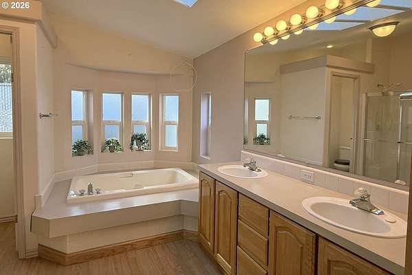 - Ceiling Fan, High Ceilings, Laminate Flooring, Laundry, Skylight, Soaking Tub, Vaulted Ceiling, Vinyl Floor, Wainscoting, Wallto Wall Carpet