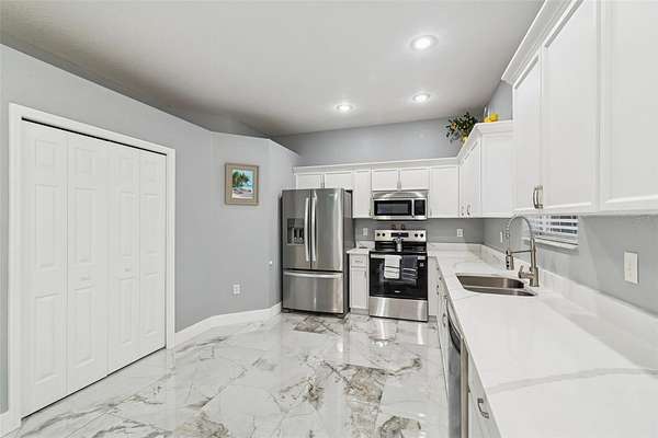 At the heart of the home is the upgraded chef's kitchen, featuring new stainless steel appliances, quartz countertops, premium cabinetry, and ample counter space. Overlooking the living and dining areas, the kitchen creates a seamless flow that's ideal for hosting guests or enjoying relaxed family meals in a bright, airy setting.