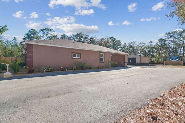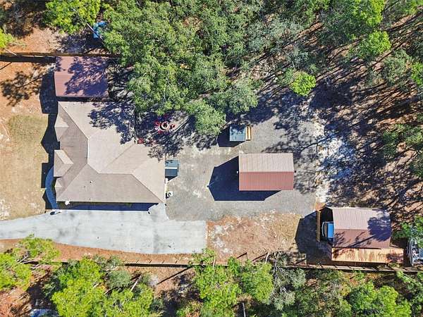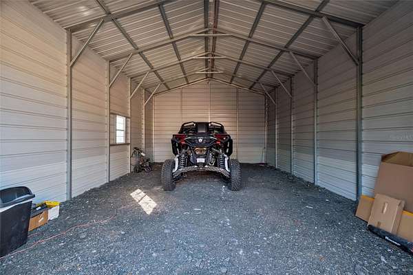Toward the back of the home, an enclosed lanai opens to a private, fenced backyard, providing a peaceful space for relaxing, entertaining, or weekend projects. The property also features metal carports, a detached garage, and additional storage, offering plenty of room for vehicles, equipment, and hobbies.