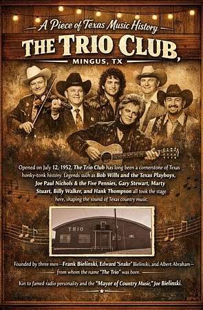 Step into a piece of authentic Texas history with The Trio Club, a legendary honky tonk located in the heart of Mingus, Texas. Known for decades as a gathering place for live music, dancing, and unforgettable nights, The Trio is more than a building--it's a cultural landmark with deep roots in Texas nightlife. This historic venue exudes classic honky-tonk charm, featuring a spacious dance floor, performance stage, bar area, and the unmistakable atmosphere that only time and tradition can create. Generations of patrons have passed through its doors, making it a beloved destination for locals and travelers alike. A new outdoor stage and concrete dance floor was added in early 2025 to allow for larger outdoor concerts.