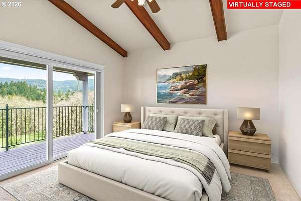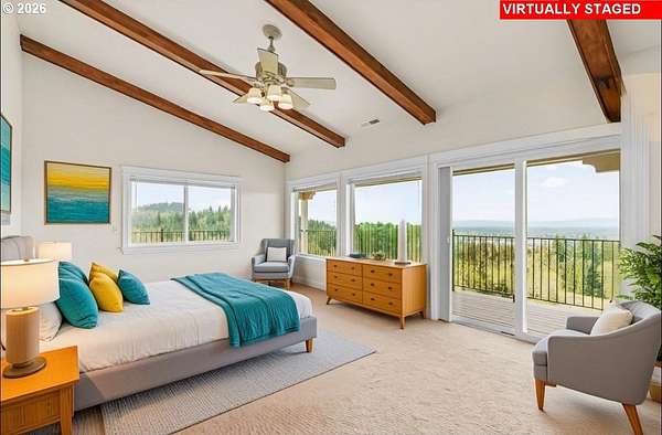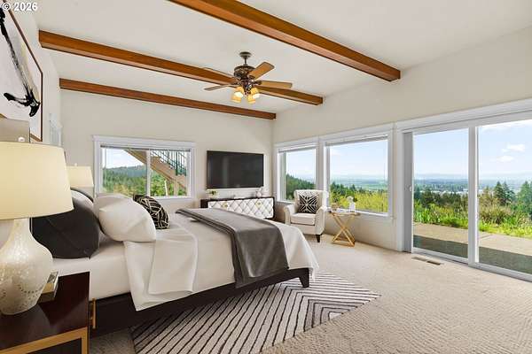 Experience breathtaking views from this custom-designed Tudor-style home on over 11 acres. Nestled high in Eugene's sought-after Coburg Hills and located within a private gated neighborhood known as Cloud Nine Ranch, this home offers million-dollar view with stunning sunsets and inspiring city/night lights. The many expansive parcels of this neighborhood share private access and a community well known for some of the finest water in the valley. This home is well suited for multi-generational living, offering ample spaces for both family and entertainment. Inside, you'll find a beautifully crafted interior that combines contemporary design with Old World charm, rich wood surfaces, abundant natural light, and soaring ceilings throughout. Whether it's hosting a dinner party, displaying your finest artwork, or relaxing with family, you'll appreciate the room to grow and entertain. The main level features a spacious kitchen, breakfast nook, cozy family room, formal living and dining rooms, one of two laundry rooms within the home, and a luxurious primary suite complete with a walk-in shower, jacuzzi tub, walk-in closet, and valley views. Also on the main level is an additional large bedroom with its own bathroom and separate entrance that's perfect for guests or an office. Upstairs, you'll find a large bonus/family room with a wet bar, three generously sized bedrooms, two full bathrooms, a helper's quarters (Bedroom 6) with its own private access. The second laundry room, complete with a utility sink and storage, is also conveniently located on this upper level. Above the three-car garage, the 800 sf separate guest unit features a kitchenette, full bathroom, balcony, and private entrance, with easy access to the main house and lower laundry. Stay comfortable year-round with efficient forced-air HVAC systems or relax by the wood fireplace with a Heatilator fan. Enjoy lots of wildlife and peaceful surroundings in this unparalleled lifestyle!
