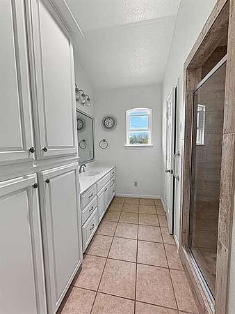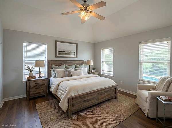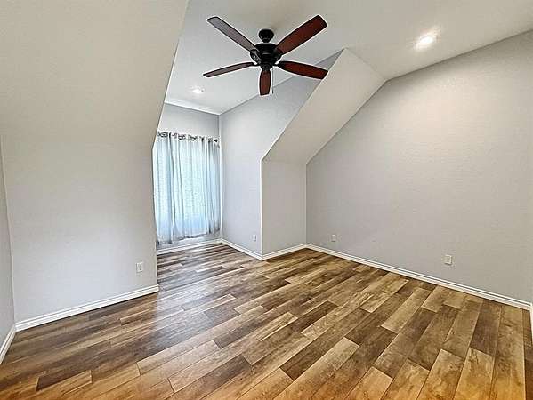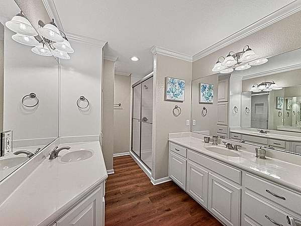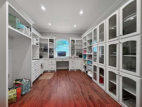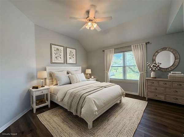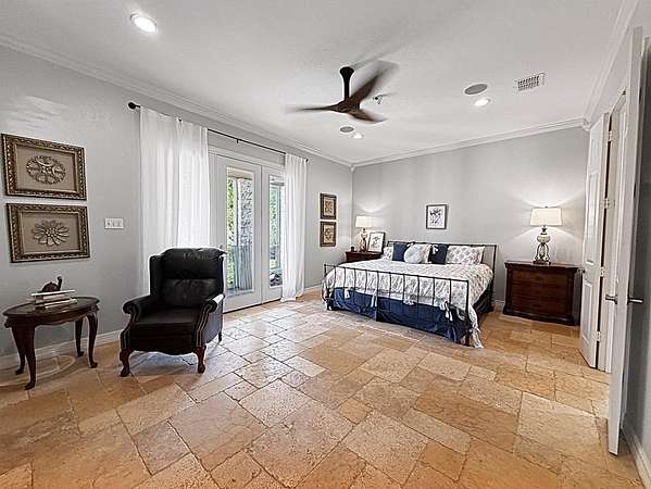 The primary suite is a serene retreat with private access to an enclosed patio—perfect for morning coffee. The spa-inspired bath includes a luxurious soaking tub, oversized walk-in shower, and a laundry closet for a stackable washer-dryer. A massive walk-in closet features floor-to-ceiling built-ins for exceptional storage.