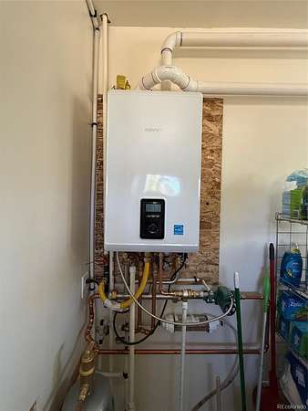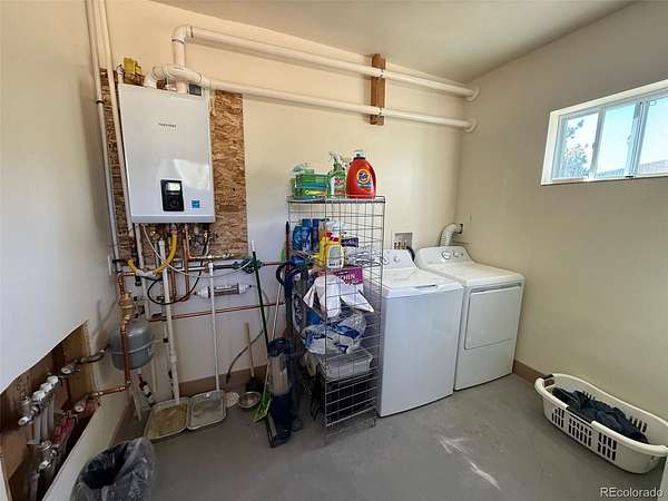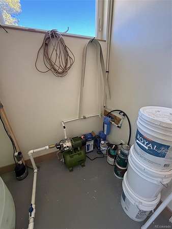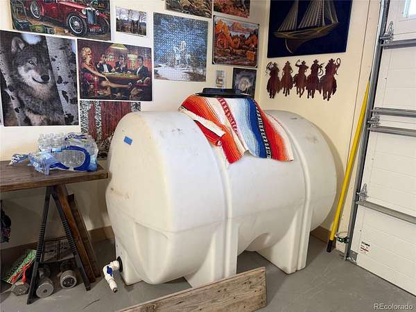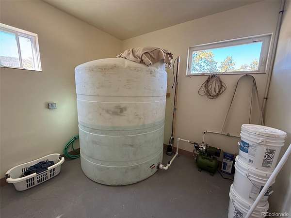 The bedroom has nice windows looking out and the bathroom has a space saving walk-in shower. The utility room houses the washer, dryer, in-floor heat system, and a 1000 gallon cistern for water.