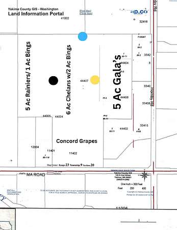 26.48 Total Acres 6 Acres Concord Grape Vineyard. 5 Acres Galaxy Galas, 26 Root Stock planted in 1988. 5 Acres Rainiers with 1 acre Bings on Colt root stock, planted in 1999. 6 Acres Chelans with 2 acres Bings on Mazzard root stock, planted in 2012. 10 Hp single-phase irrigation pump. Overhead and Ground Irrigation managed with automatic timer system. 2014 Yellow Tip, Orchard Rite with propane auto start. 1999 Black Tip, Orchard Rite with propane auto start. One 3000 Gallon Propane Tank for the heating system, owned. Three 1,100 gallon propane tanks for the heating system, owned. Two 500 gallon propane tanks for the wind machines, owned. 14 acres of cabled bird net cover. Loading area with cabled net shade cover. Realtor is owner of Big Fruit LLC and licensed in the State of Washington.
