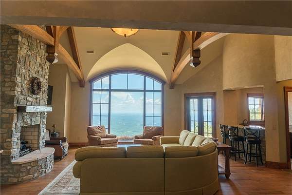 Welcome to 91 The Cliffs Parkway, a stunning European inspired residence offering exceptional luxury and breathtaking panoramic views of the valley below. Located in The Cliffs at Glassy, this remarkable home blends old world craftsmanship with modern comfort, creating a refined yet peaceful mountain retreat. No expense was spared in the construction and design of this home. Rich architectural details such as hand scraped beams and custom trim add warmth and character throughout, while a 50 year cedar roof provides both beauty and long term durability. From the moment you enter the foyer, you are greeted by soaring vaulted ceilings, custom stonework, and expansive windows that fill the home with natural light and showcase the spectacular scenery. The spacious floor plan features four beautifully appointed bedrooms and four luxurious full bathrooms, each finished with high end materials and thoughtful design. The chef's kitchen is a true centerpiece of the home, complete with premium appliances, custom cabinetry, and a large island ideal for cooking, entertaining, and gathering with family and friends. Each bathroom offers a spa like retreat with elegant finishes and refined details. Additional features include a whole house generator for year round peace of mind and a temperature controlled workshop just off the garage, perfect for hobbies, projects, or additional storage. Step outside to your own private mountain oasis. A beautiful waterfall feature provides a soothing backdrop for outdoor living, while expansive terraces offer the perfect setting for morning coffee, quiet relaxation, or entertaining guests. The sweeping views of the rolling hills toward Greenville are simply unforgettable.