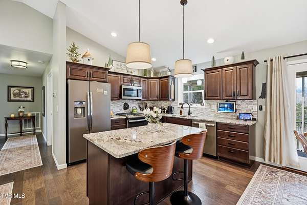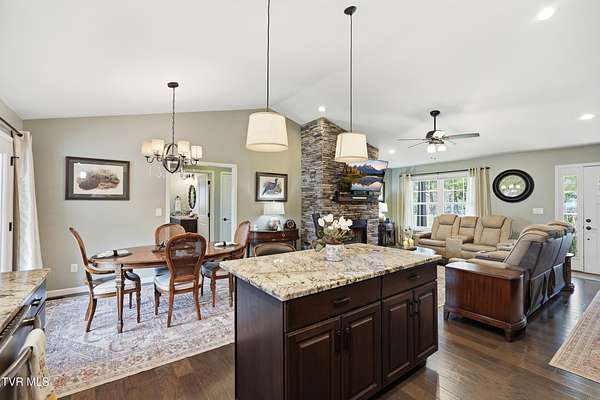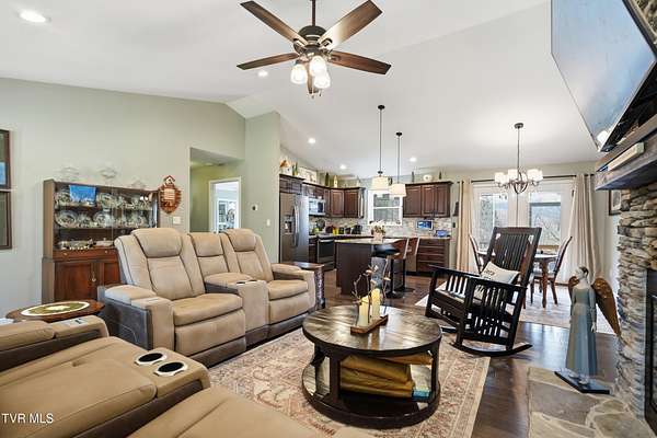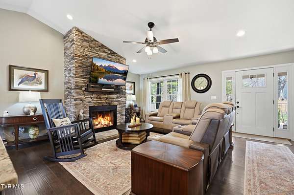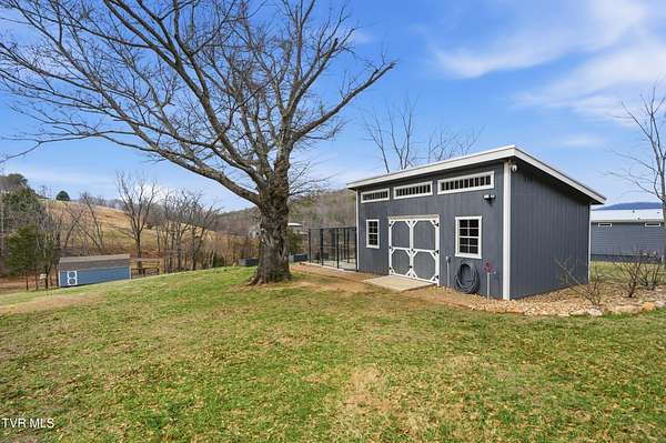 Stunning 4-5 bedroom, 3- bath custom home offering approximately 3,284 sq ft on 2.5 private acres with beautiful mountain views. The home features 1,889 sq ft on the main level and 1,395 sqft in the finished walk out basement.Construction began in the 2018, was completed in 2019, with additional upgrades completed in 2022-making all major components less then 7 years old. This thoughtfully designed property blends space, function, and privacy, ideal for multi-generational living, hobbyists, or those seeking room to spread out. The main level showcases an open living area with vaulted ceilings, a striking stone fireplace, hardwood and tile flooring, and a well-appointed kitchen with granite countertops and upgraded gas range.The primary suite includes an upgraded walk-in shower and generous closet space. A large laundry room with pantry storage adds everyday convenience. The finished walk-out basement offers a spacious flex room ideal for a second living area, home gym, media room, or optional additional bedroom. The insulated and finished lower garage adds exceptional versatility and usable space. Outdoor living is a standout, featuring a screened-in porch and two decks with gas hookup for grilling- perfect for enjoying peaceful mornings and sunsets framed by scenic mountain views. The property also includes a fenced front yard, raised garden beds, mature landscaping, and multiple outbuildings including a dog barn with kennels and a newer barn with electric. Additional highlights include a 24k Generac whole-home generator (approx. 1.5 years old), 10-camera security system with NVR, wide doorways, and bathroom grab bars. Peaceful and private, this property offers a rare combination of acreage, modern upgrades, and move-in readiness. Homes with this level of space, land, and mountain views are rarely available-schedule your showing today.