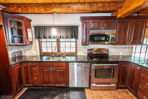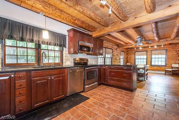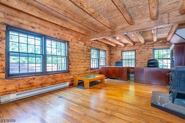 Could your next home be a log cabin in the woods? Welcome to this charming 3-Bedroom, 2-Bath log home on 2 acres in the beautiful Frelinghuysen/Blairstown area of western Jersey. This sturdy, well-maintained log home is situated on a private, wooded lot with it's own stream! The interior is gorgeous- updated kitchen and baths, SS appliances & granite countertops, hardwood floors and oversized windows overlooking your own forest oasis! Formal dining and large living room w wood stove, kitchen w breakfast bar and full bath comprise the first floor. Second floor has 3 nice-sized bedrooms, walk-in closet and full bath. Walk-out basement is huge w finishable space, laundry and storage. But the deck! Newly reinforced and stained- outdoor living space at it's best! Play in the huge yard (playset included), entertain inside and out... This gem is perfect for year-round living, or a getaway any season of the year. Move-in ready with newly updated heating system, UV water filter/softener, newer roof. Just unpack!