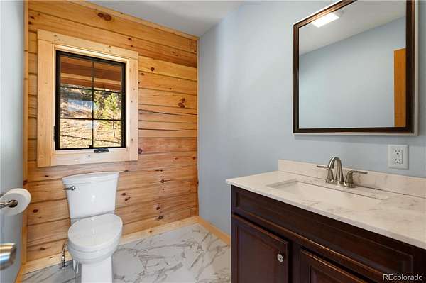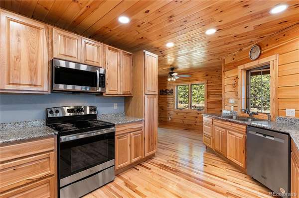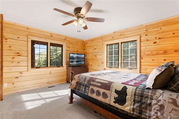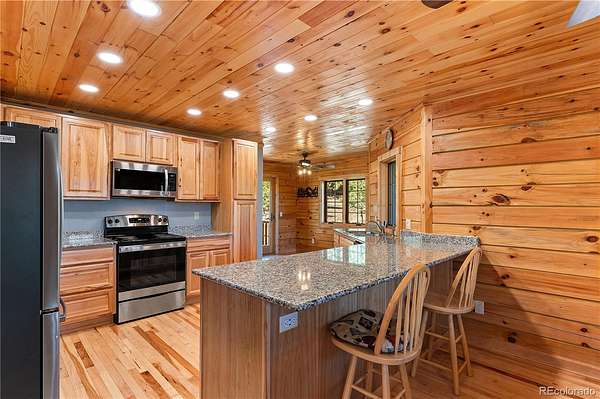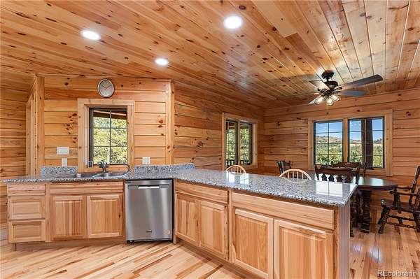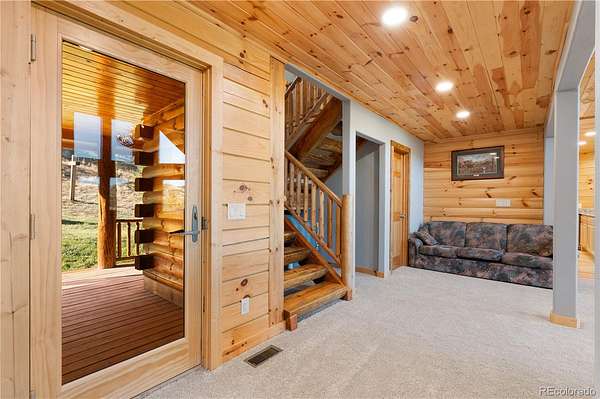 The handcrafted home showcases classic Colorado log cabin architecture with a striking green metal roof and full-length covered porches on both the front and back—ideal for relaxing and soaking in the natural beauty. Inside, an open-concept main level welcomes you with soaring vaulted ceilings, tongue-and-groove wood finishes, and expansive windows that flood the great room with natural light.