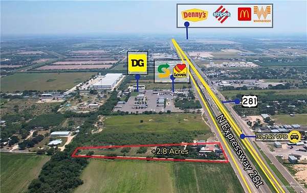 Est $3,254/mo2.26 NET ACRES OF COMMERCIAL FRONTAGE. This property is equipped with electricity and city water. The potential for this property is endless and the location is ideal: directly off expressway 281 (high traffic) FRONTAGE PROPERTY and after the bustling Love's Truck Stop with a new Subway and Dollar General nearby. Just 10 minutes south are several new residential communities and some established ones too. Edinburg is growing at a rapid rate. Submit your offer today! All tires and tire equipment will be removed from the property at closing.