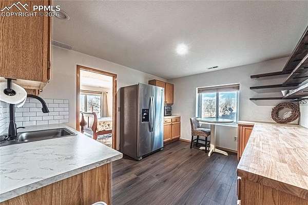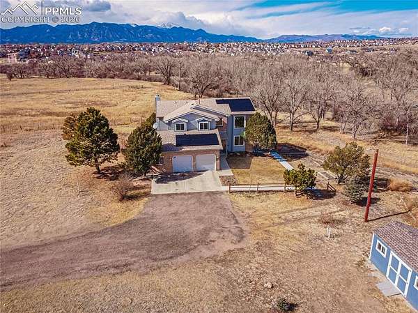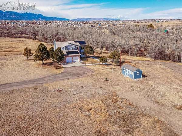 Rarely does a property offer both immediate multigenerational living flexibility and future building potential - but this one offers this and so much more! Situated on 8.72 acres with a city tap permit already in place, this extraordinary property presents the opportunity for subdivision or the addition of another home, while also delivering a fully functional walkout basement suite ideal for extended family, guests, or potential rental income. The lower level features a private ensuite, additional bedroom, living room, kitchenette, and its own laundry space - creating true independence within the home. Inside, over 115k in thoughtful owner upgrades elevate every space. The gourmet kitchen is a showpiece with beamed ceilings, an oversized country pantry with expanded prep and storage space, and seamless flow into the vaulted formal dining room. Freshly finished natural hardwood floors, brand-new carpet throughout, and paid-off solar panels blend style with efficiency and long-term savings. Step outside and experience what truly sets this property apart. Panoramic, unobstructed views of Pikes Peak and the entire Front Range stretch across nearly 9 acres of open pasture, forested privacy, and a creek. Enjoy peaceful mornings on the back deck watching wildlife pass through, host family campouts alongside the stream, garden, or simply embrace the serenity of wide-open Colorado living - all on your own land. The attached 2-car garage includes a workshop and two 220V outlets for EV charging. Two storage sheds and an updated chicken coop add even more versatility to the property. Just minutes from shopping, dining, gas stations, Fort Carson, and Peterson Space Force Base offering the rare balance of convenience and rural seclusion. Privacy. Views. Infrastructure. Flexibility. Future upside. Properties with this combination of acreage, improvements, and development potential rarely become available, so don't miss out on this one!