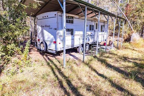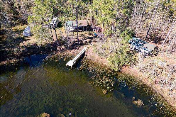This land is equipped with a deep well, septic tank, and three campers already set up, each with its own power pole and built-on porch. Enjoy a stocked pond with a dock, perfect for relaxing or fishing.