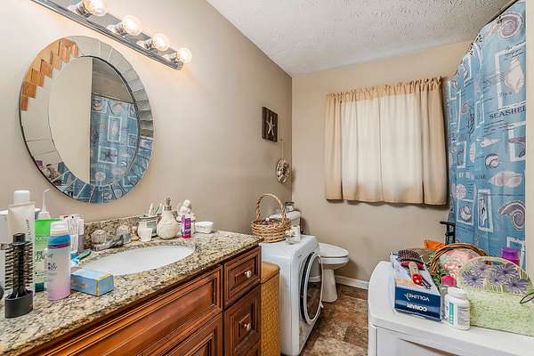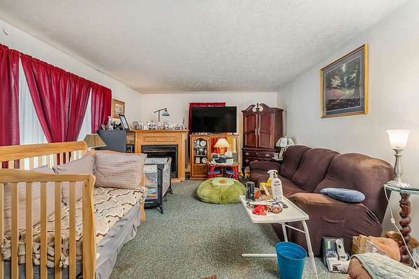 The home has a functional layout with a spacious living area, eat-in kitchen, and three main-level bedrooms. Kitchen appliances include an electric range. Flooring consists of carpet and laminate. Utilities include utility district water and a septic system. Heating and cooling are central heat and central air. Home is equipped with a tankless water heater. The unfinished basement includes a gas wall heater, helping maintain a comfortable temperature and offering additional usable space.