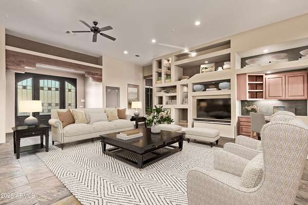 Stunning Santa Fe-style retreat that blends timeless architecture with modern luxury! Set on a beautifully landscaped cul-de-sac desert lot with a circular driveway and a 4-car garage, this residence offers a serene Southwest charm. Explore the open layout with natural light, stone floors, recessed lighting, ceiling fans, plantation shutters, and a striking two-way fireplace that anchors the living spaces. A cozy media niche and built-in desk area add functionality to the design! The gourmet kitchen has SS appliances with double ovens, granite counters, wood cabinetry, a breakfast bar island, and elegant pendant lighting. Discover a large main bedroom boasting a spa-like ensuite with dual vanities, a stone steam shower, and a walk-in closet. An additional two secondary bedrooms which include their own private bath, love the generous den and oversized laundry room, including cabinets, sink, washer, dryer, and a stylish powder room! There's an exterior powder room with a vessel sink that adds a touch of luxury for outdoor guests. Experience resort-style living at its finest in the backyard comprised of incredible desert/sunset views, an L-shaped covered patio, a built-in BBQ, a sparkling pool, an inviting fire pit, a putting green, and a balcony for taking in the breathtaking scenery. Make this exceptional home yours!