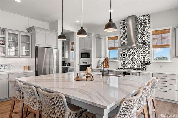 The main level is filled with natural light, featuring soaring ceilings, walls of windows, and a seamless connection between the great room, kitchen, dining, and outdoor living spaces. The kitchen is anchored by an oversized island, quartz countertops, custom cabinetry, dual ovens, a 5-burner gas range, and a butler’s pantry with beverage center, designed for both everyday living and entertaining.