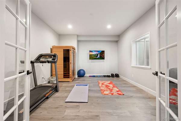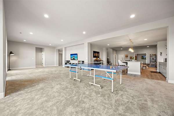 The finished walkout basement expands the home with high ceilings, a full wet bar, large recreation space, dedicated theater room, fitness room with sauna, and guest bedrooms with ensuite and Jack-and-Jill baths, ideal for entertaining or multigenerational living.