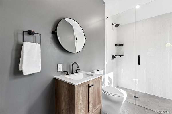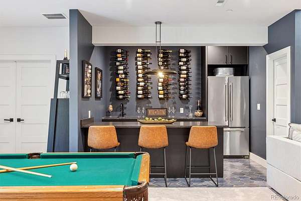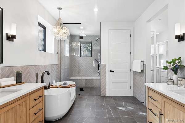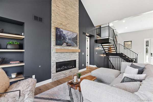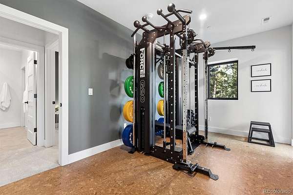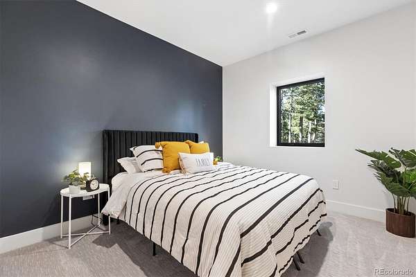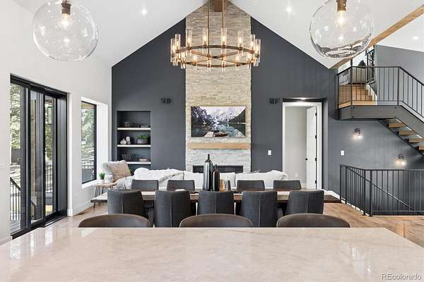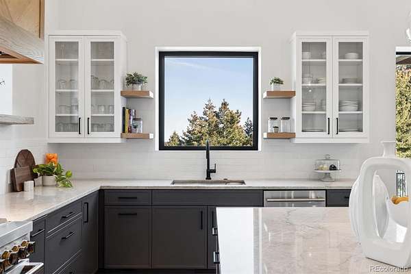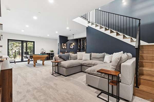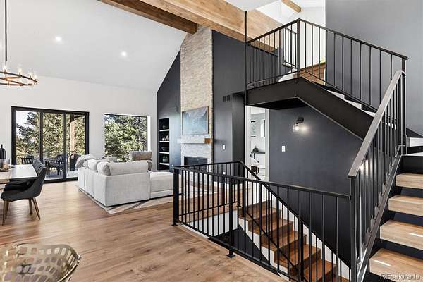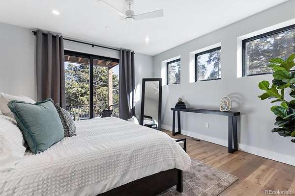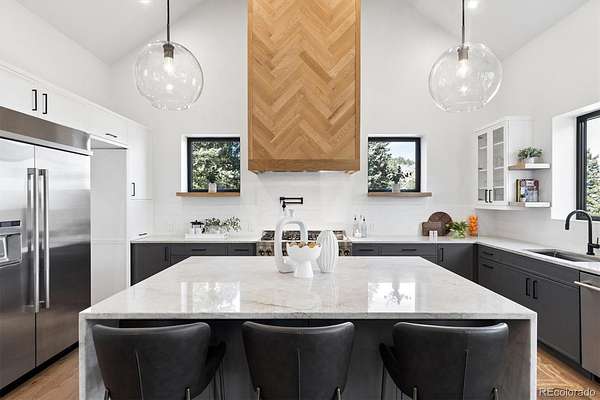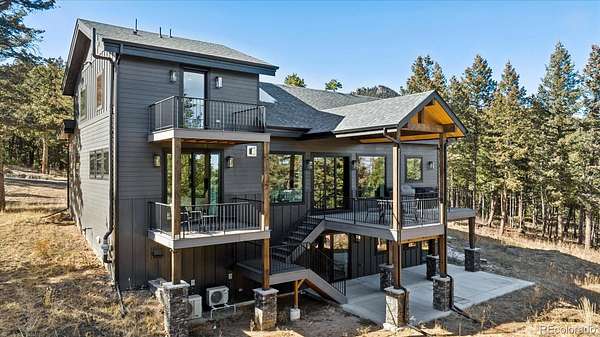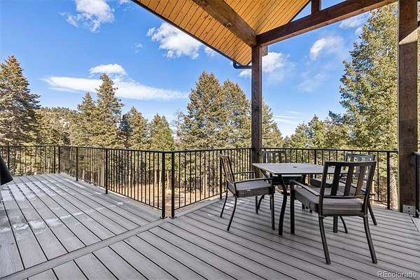 Welcome to this custom-built property that perfectly blends modern design with warm mountain luxury. Upon entering the front door, you are welcomed into an inviting foyer overlooking the open concept main floor which will simply take your breath away - it's a place designed for gathering & entertaining, pairing expansive vaulted ceilings with a wall of windows to provide a cozy refuge. The main floor living space flows effortlessly from the family room to the dedicated dining area and then into the kitchen which is home to a massive hidden pantry and adjacent laundry room. The Chef's dream kitchen features a stunning waterfall Tahiti quartzite island, thoughtful storage solutions, professional JennAir appliances, pot filler, custom chevron wood hood, hidden coffee bar, built-in ice maker & more! The stunning light fixtures, custom tile and hardwood floors compliment the design elements meticulously chosen in this modern retreat. The main floor primary suite is filled with abundant natural light from a sliding glass door that accesses a private covered deck. Open the barn door and step into the luxurious spa inspired 5-piece bath complete with a free-standing tub, heated floors, large walk-in shower and a private water closet as well as a walk-in closet. Upstairs you’ll find a loft suite complete with another bedroom, a private deck and bathroom and dedicated living and office space. Head downstairs to the walk-out basement and you’ll find an additional living room, 2 more bedrooms, another bathroom, dedicated home gym, and an incredible wet bar with built-in wine racks, a wine fridge and a full-size Jenn Air refrigerator. This stunning property is situated on 13+ acres of Colorado perfection surrounded by ponderosa pines. This is truly a residence where mountain serenity meets city convenience as you’re just 20 minutes to C-470.