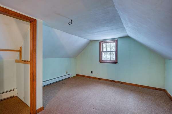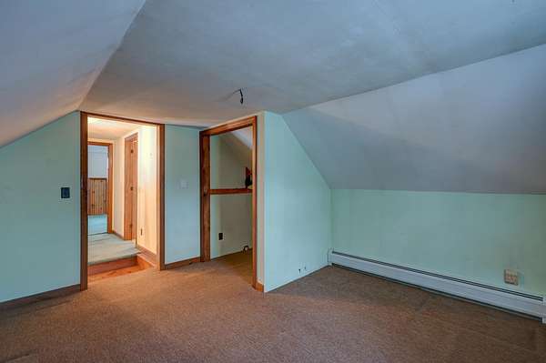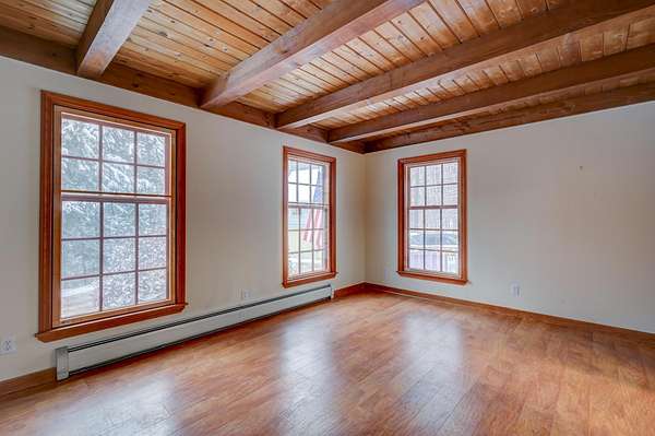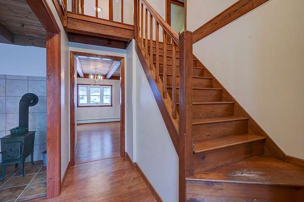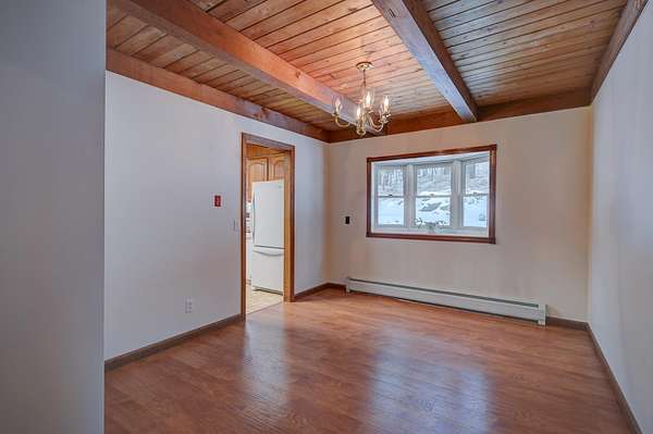 Cute country Cape set back on over 10 private acres! This inviting property features a detached two-car garage with space above that's perfect for a home office, bunkroom, or extra storage. Inside, you'll find a spacious kitchen that opens to a separate dining room and a large family room with hardwood floors and a cozy wood stove. The first-floor primary suite offers beautiful wide pine flooring, a walk-in closet, and a 3/4 bath for easy one-level living. Upstairs are two generously sized bedrooms and a full bath with a relaxing soaking tub. Ideally located just minutes from skiing, snow tubing, and cross-country skiing at King Pine Ski Resort, plus access to the beaches and boat launch at pristine Silver Lake, all just a short drive away!