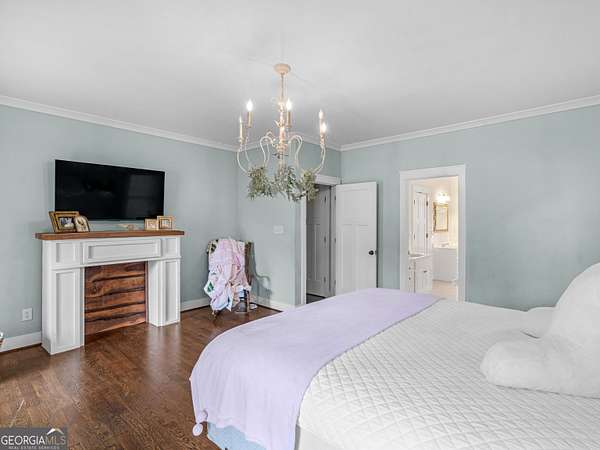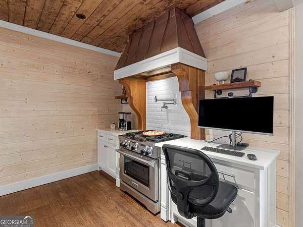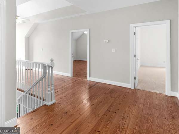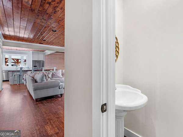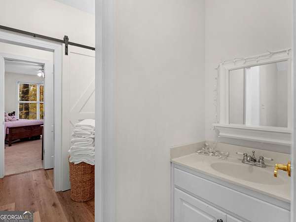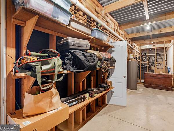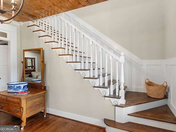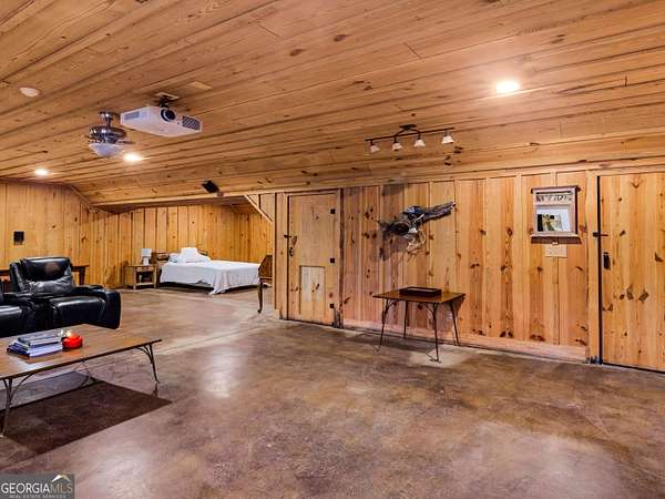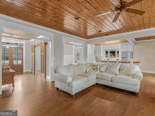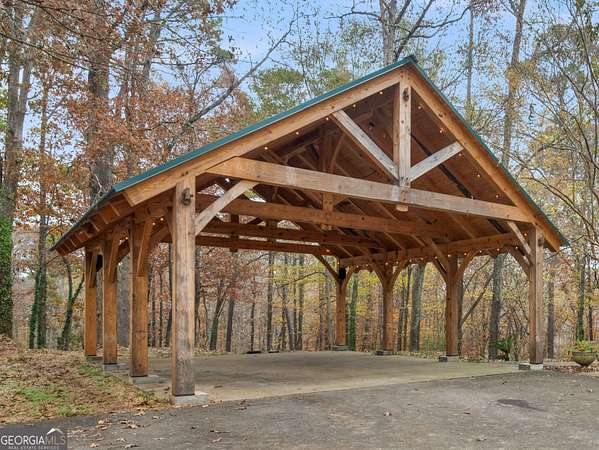 Stunning farmhouse-style retreat on 2 private acres with a peaceful creek, offering space, privacy, and timeless charm. This 5-bedroom, 4-bath home with 4,392 sq ft features a striking green metal roof, inviting wraparound porch, and serene wooded views. Inside, enjoy warm hardwood floors, wood plank ceilings, and an open-concept layout ideal for everyday living and entertaining. The main level includes a spacious living area, chef's kitchen with oversized island and stainless steel appliances, dedicated office, and a primary suite on the main with ensuite bath featuring dual vanities, soaking tub, and separate shower. The finished terrace level provides flexible living space with a lodge-style feel, stone fireplace, media area, guest accommodations, and abundant natural light with outdoor access-perfect for entertaining or extended stays. Outdoors, enjoy expansive porches, a beautiful large 16' x 24' Custom constructed covered pavilion milled on site with hand chiseled joints. This amazing property features the Towaliga creek, mature trees, and plenty of room to relax or entertain. This property offers privacy, space, and a true retreat lifestyle-just minutes from everyday conveniences. A rare opportunity to own a private, versatile property that blends comfort, character, and natural beauty!