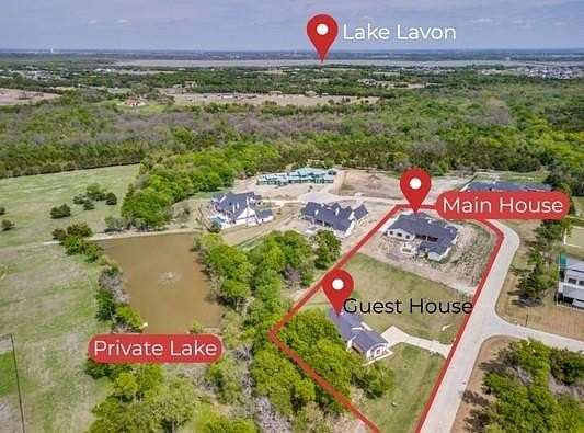 Luxury Estate Opportunity. Private Lake Views. Guest House + Custom Dream Build. Set on 2.53 acres in an VERY EXCLUSIVE gated community in LovejoyISD, this extraordinary property offers a rare chance to complete a custom-designed dream home while living on-site. The 1493sf guest house with lake view is nestled in the trees - a move-in ready retreat while you bring the impressive 6718sf main home to life. Atop a gentle rise with lake views, the main home is already well underway, with high-end design, quality craftsmanship, and a thoughtfully designed floor plan. Expansive windows and sliding glass doors flood the home with natural light while the sleek fireplace, soaring ceilings, and exposed wood beams create a warm, modern luxury aesthetic. Designed for everyday living & entertaining, the open-concept living, dining, and kitchen features a dramatic wall of glass overlooking the future outdoor living space with multiple covered patios and a pool. The chef’s kitchen includes a statement island, custom cabinetry, pot filler, and dual-pantry - complete with a prep kitchen designed for high-end appliances such as a built-in coffee system & full-size wine fridge. The primary retreat offers a spacious sitting area with patio access, spa-inspired bathroom with steam shower, dual vanities, and space for a freestanding tub. With 5 bedrooms, 5 full & 3 half baths, the home includes a study with a hidden room, media room, recreation room-pool house, hobby room, and distinct wings for family and guests. The children’s wing features two ensuite bedrooms with walk-in closets and its own living area. *The Guest House with 2-bed 2-bath has a full kitchen with custom cabinets, island, open living and dining, and study.* With substantial construction already complete, this property offers a unique blend of immediate livability and future customization—allowing the next owner to finish the main home to their discerning vision while enjoying a high-quality residence from day one.