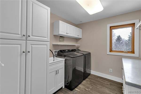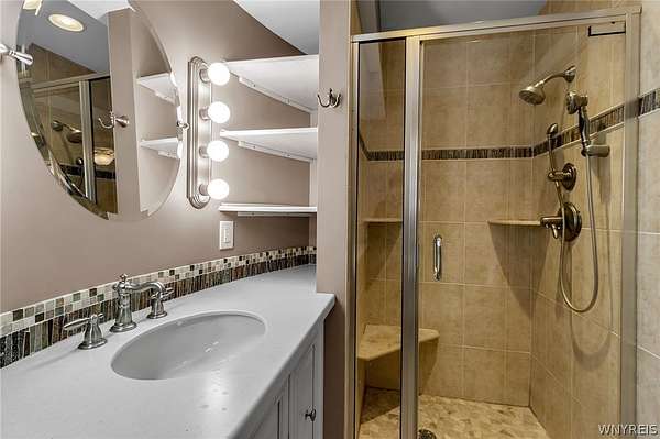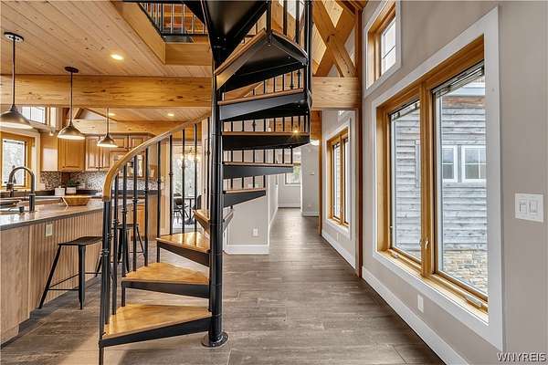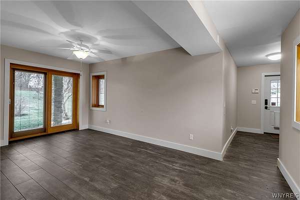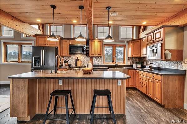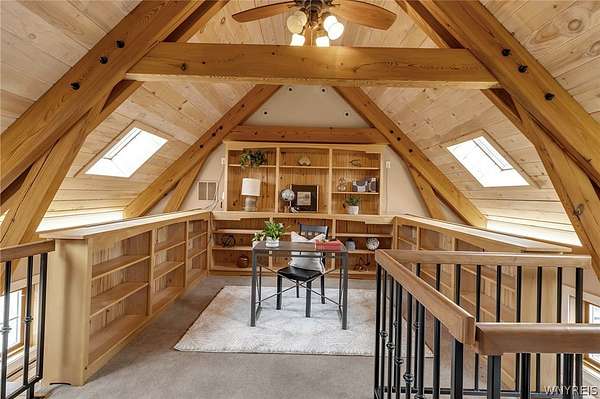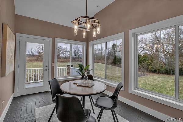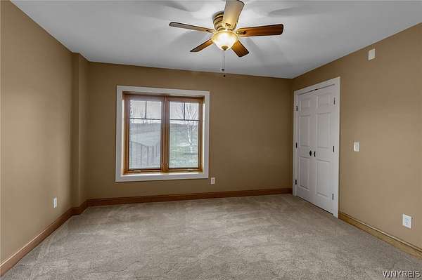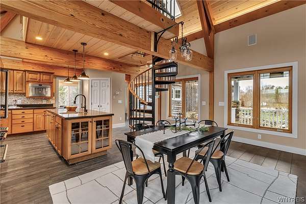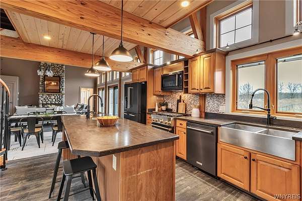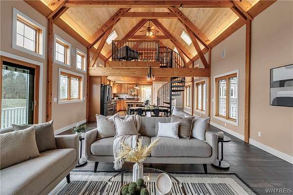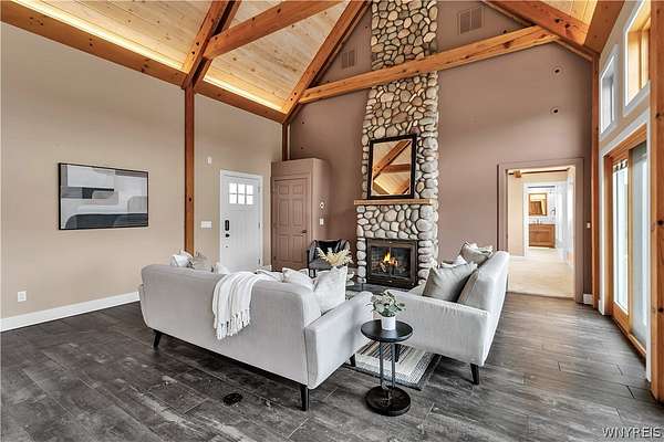 This beautiful and spacious 4-bedroom, 4.5-bath home on 10 acres in the Town of Batavia offers a versatile layout designed for comfort, privacy, and entertaining. The open-concept first floor features a bright living area highlighted by a dramatic two-story stone gas fireplace and exposed beams, creating a warm and inviting centrepiece. Heated floors add an extra level of comfort throughout the main living space. The kitchen flows naturally into the living area, while a separate formal dining room provides the perfect space for gatherings and special occasions. The main-floor primary suite offers a private retreat with a dream en-suite bath and walk-in closet featuring custom cabinetry. A loft space overlooking the main living area adds character and flexibility-ideal for a home office, reading area, or additional lounge space. The second floor includes a bedroom with a full bathroom and a versatile flex space perfect for storage, crafting, or other hobbies. The walkout lower level provides excellent flexibility with two bedrooms, both with full bathrooms, and a separate living area, making it an ideal setup for an in-law suite, guest accommodations, or private living quarters. Sliding doors lead directly to a patio and the expansive fenced backyard. Additional highlights of this Genesee County home include an attached heated 3-car garage, first-floor laundry, a whole-house solar system, a backup Generac generator, multi-zone heating, central A/C and an on-demand water heater. And animal lovers will appreciate the large fenced yard and pet spa station. Conveniently located between Rochester and Buffalo with easy access to the New York State Thruway (I-90), this property offers the perfect blend of privacy, space, and accessibility. Showings begin immediately, with offers being reviewed as they are submitted. The 10 acres will be parcelled off from the current 72-acre lot. The lot lines are to be determined. Tax records indicate the home is 2,660 sq. ft., but a recent appraisal shows it is 4,440 sq. ft.