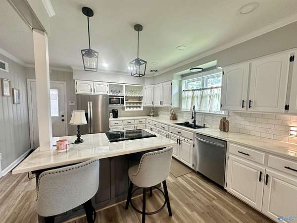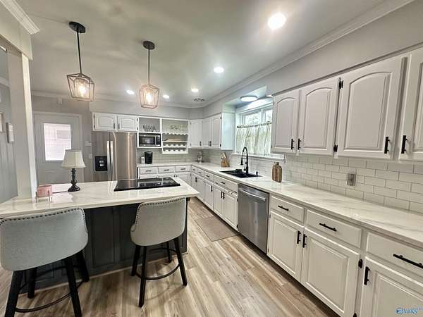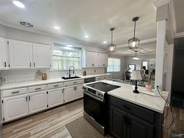 Beautifully updated 1950's home located near the Downtown Historic District. Home feat. an inviting foyer, 4BR/3BA, large open kit & DR, formal LR w/wood-burning fireplace as well as a large downstairs flex room. This is a great home for entertaining and/or a large family. HVAC was replaced in 2023. Low maintenance metal roof;updated paint inside & out, LVP flooring, windows, lighting, door hardware, plumbing fixtures in kitchen & baths, Kitchen feat SS appl, tile b-splash, pantry, island w/b-fast bar; Downstairs feat BR/BA, den & laundry room; Great space for MIL suite or teenager; a single garage carport on main level & 2 car garage (back to back) on the lower level. Don't miss out!