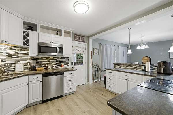 The backyard is partially wooded, providing a scenic setting. The property offers a flexible floor plan and ranch-style design, all located on a rare acreage parcel within city limits.